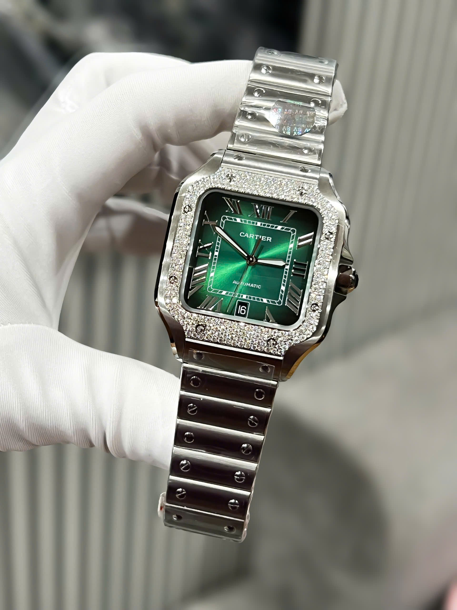 Cartier Santos Customs Moissanite Diamonds Green Dial Swiss 1:1 Watches BVF 39.8mm