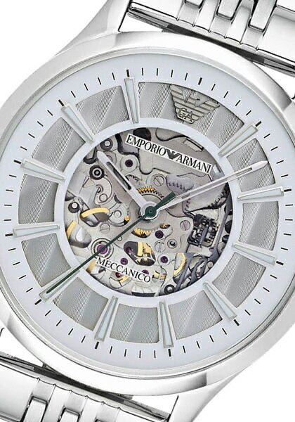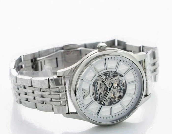 Emporio Armani Meccanico Skeleton Silver Dial Silver Steel Strap Watch For Men - AR1945