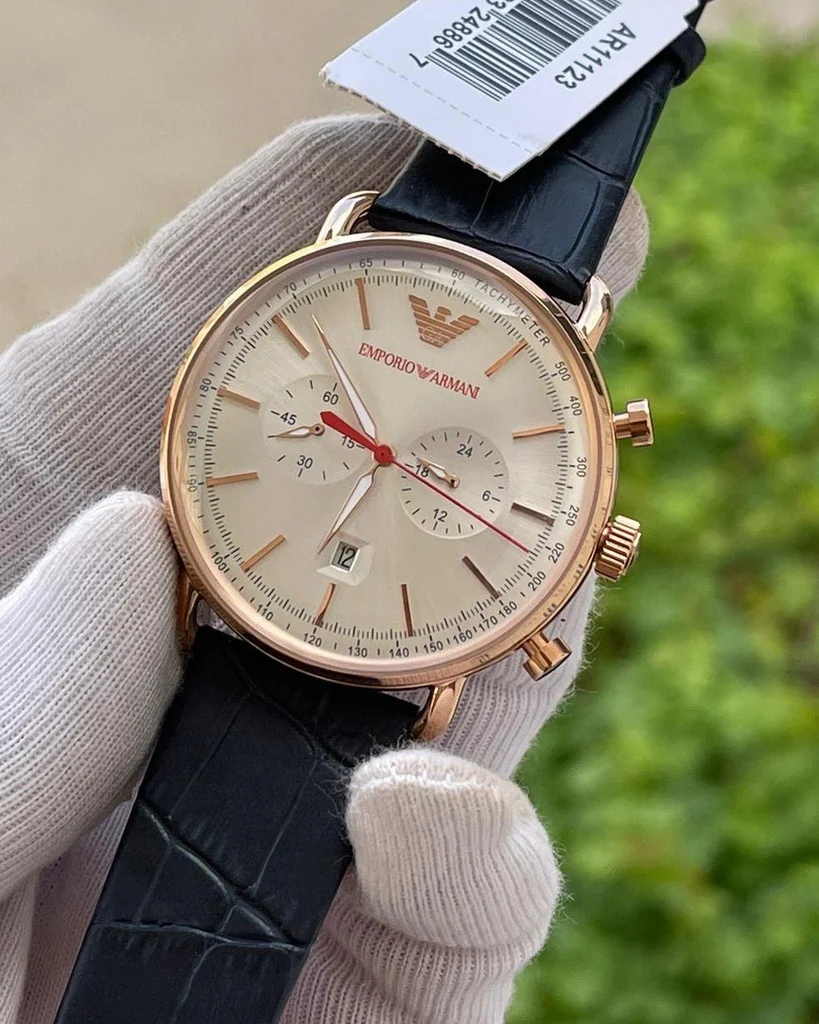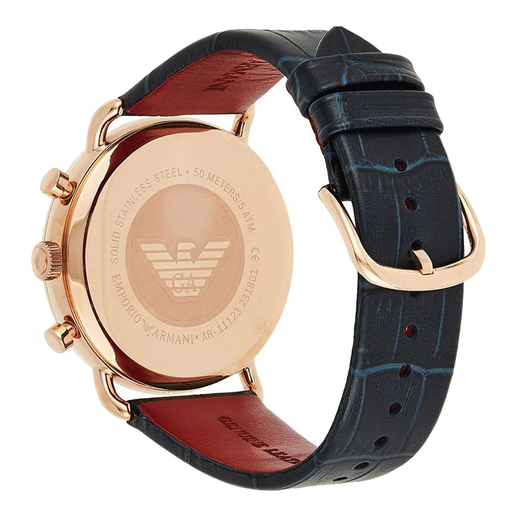 Rose gold PVD stainless steel case with a dark blue leather strap. Fixed rose gold PVD bezel. Silver dial with luminous rose gold-tone hands and index hour markers. Minute markers. Tachymeter mnarkings around the outer rim. Dial Type: Analog. Luminescent hands. Date display at the 6 o'clock position. Chronograph - two sub-dials displaying: 60 second and 24 hour. Quartz movement. Scratch resistant mineral crystal. Pull / push crown. Solid case back. Round case shape. Case size: 43 mm. Case thickness: 12 mm. Band width: 22 mm. Tang clasp. Water resistant at 50 meters / 165 feet. Functions: chronograph, date, hour, minute, second. Pilot watch style. Watch label: Japan Movt. Emporio Armani Aviator