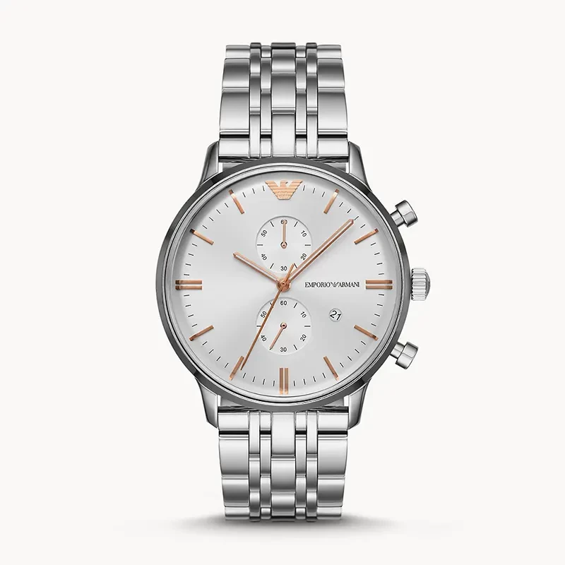 Brand: Emporio Armani, Series: Gianni, Gender: Men's, Model: AR1933, Movement: Japan Quartz, Case Size: 43mm, Dial Color: White, Case Thickness: 11mm, Case Material: Stainless Steel, Case Shape: Round, Case Back: Solid, Band Material: Stainless Steel, Band Type: Bracelet, Band Color: Silver-tone, Band Width: 22mm, Clasp: Butterfly Clasp, Crystal: Scratch Resistant Mineral, Bezel: Fixed, Bezel Color: Silver-Tone, Bezel Material: Stainless Steel, Crown: Pull / Push, Water Resistance: 50 Meters / 165 Feet, Functions: Chronograph, Date, Hour, Minute, Second, Watch Style: Casual