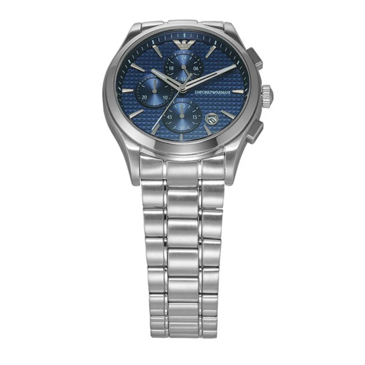 Emporio Armani's 42mm watch features a blue sunray-textured dial, chronograph movement, stainless steel case and stainless steel bracelet.