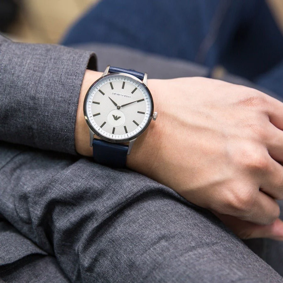 | BRAND | Emporio Armani | ANALOGUE/DIGITAL | Analogue | CASE DEPTH APPROX. | 9.00mm | CASE SHAPE | Circle | CASE WIDTH APPROX. | 43.00mm | DIAL COLOUR | Grey | GENDER | Gents | MOVEMENT | Quartz | STRAP COLOUR | Blue | STRAP TYPE | Leather strap | WATER RESISTANCE | 50 metres | BARCODE | 4053858984257 | GUARANTEE | 2 years |
