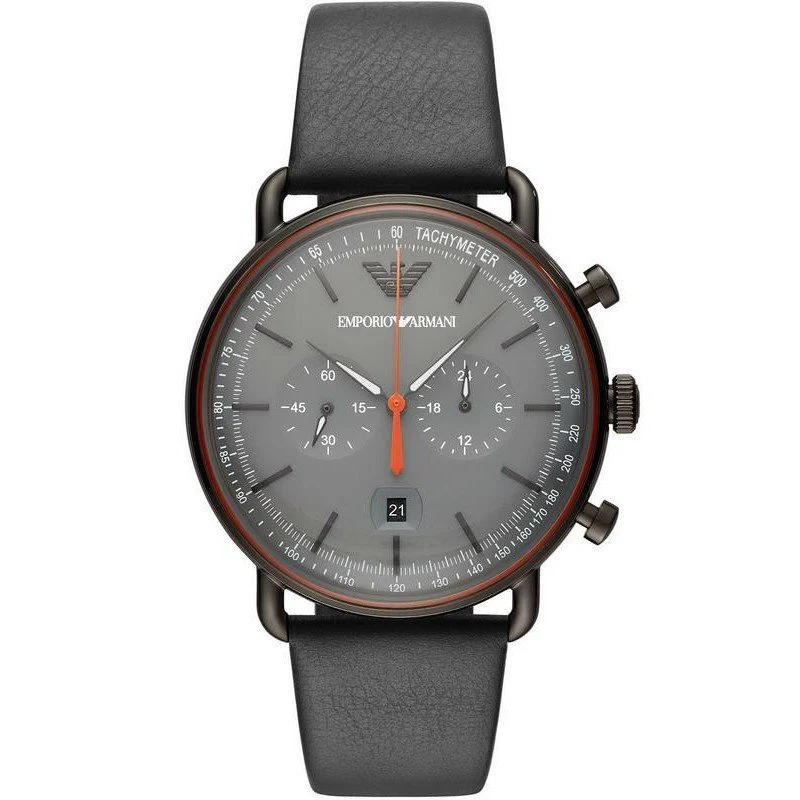 A perfect amalgamation of modern and sports styles, from the Aviator collection from the House of Emporio Armani. This grey chronograph dial features a date function, black baton hour markers, and blue touches. It fastens with a black leather strap and is powered by a quality quartz movement. This watch is surely going to leave its subject in awe with its design and performance. A secure pin buckle clasp was added for protection.