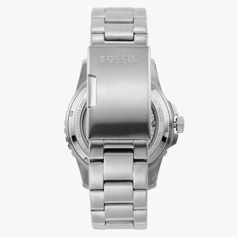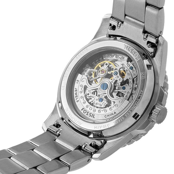 This Fossil Men's watch features a black skeleton dial with silver tone luminous hands, fixed stainless steel bezel and a silver stainless steel case with a silver-tone stainless steel strap. Automatic movement with analog display. Round case shape with a 42 mm case diameter. Scratch resistant mineral crystal. Transparent case back. Functions: Hour, Minute, Second. Water resistance up to 10 ATM.