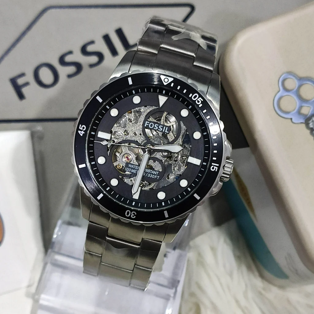 Fossil FB-01 Automatic Skeleton Black Dial Silver Steel Strap Watch For Men - ME3190