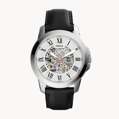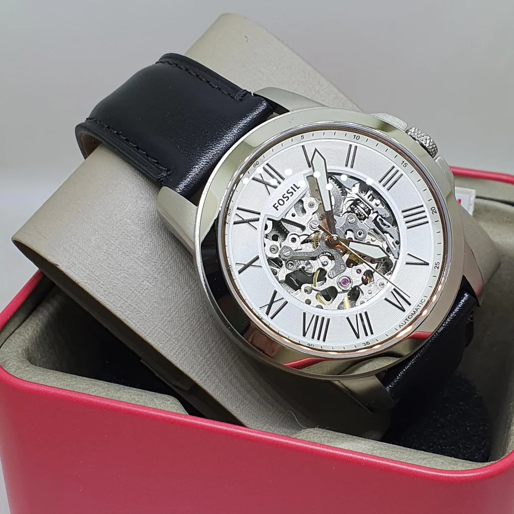 Fossil Grant Automatic Skeleton White Dial Black Leather Strap Watch For Men - ME3101