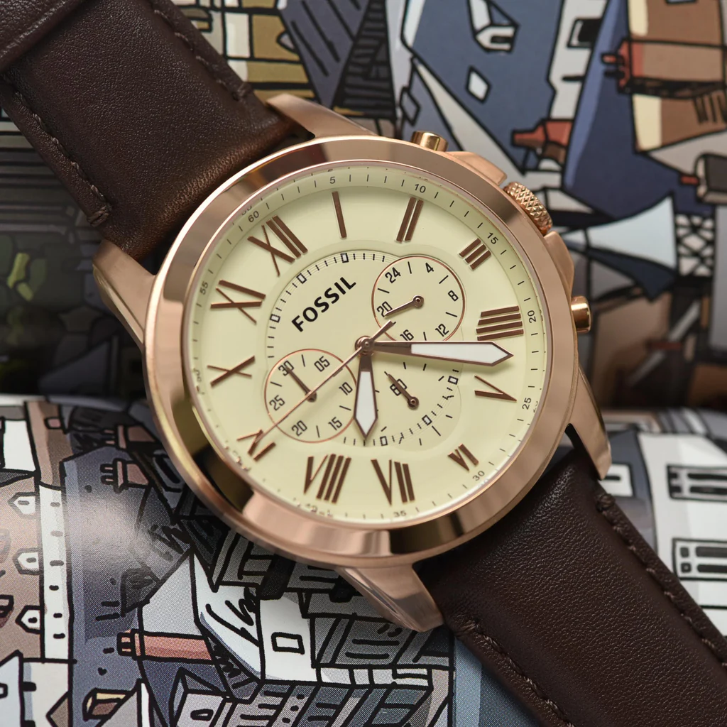 Fossil Grant Chronograph White Dial Brown Leather Strap Watch For Men - FS4991