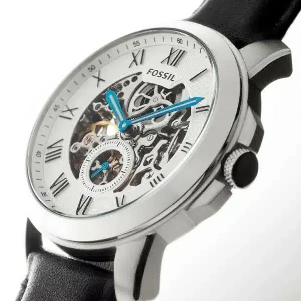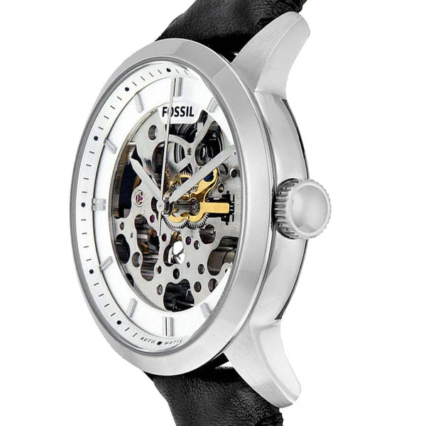 Transparent case back. Case diameter: 44 mm. Case thickness: 13 mm. Round case shape. Band width: 22 mm. Tang clasp. Water resistant at 50 meters / 165 feet. Casual watch style. Fossil Grant Automatic Self Wind Silver Skeleton Dial Black Leather Mens Watch ME3053.
