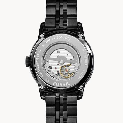 Two displays showing: 60 seconds and 24 hours. Automatic movement. Scratch resistant mineral crystal. Pull / push crown. Transparent case back. Round case shape. Case size: 45 mm. Case thickness: 12 mm. Band width: 22 mm. Single press deployment clasp. Water resistant at 50 meters / 165 feet. Functions: hour, minute, second. Casual watch style. Fossil Townsman Multi-Function Automatic Black Dial Men's Watch ME3062.