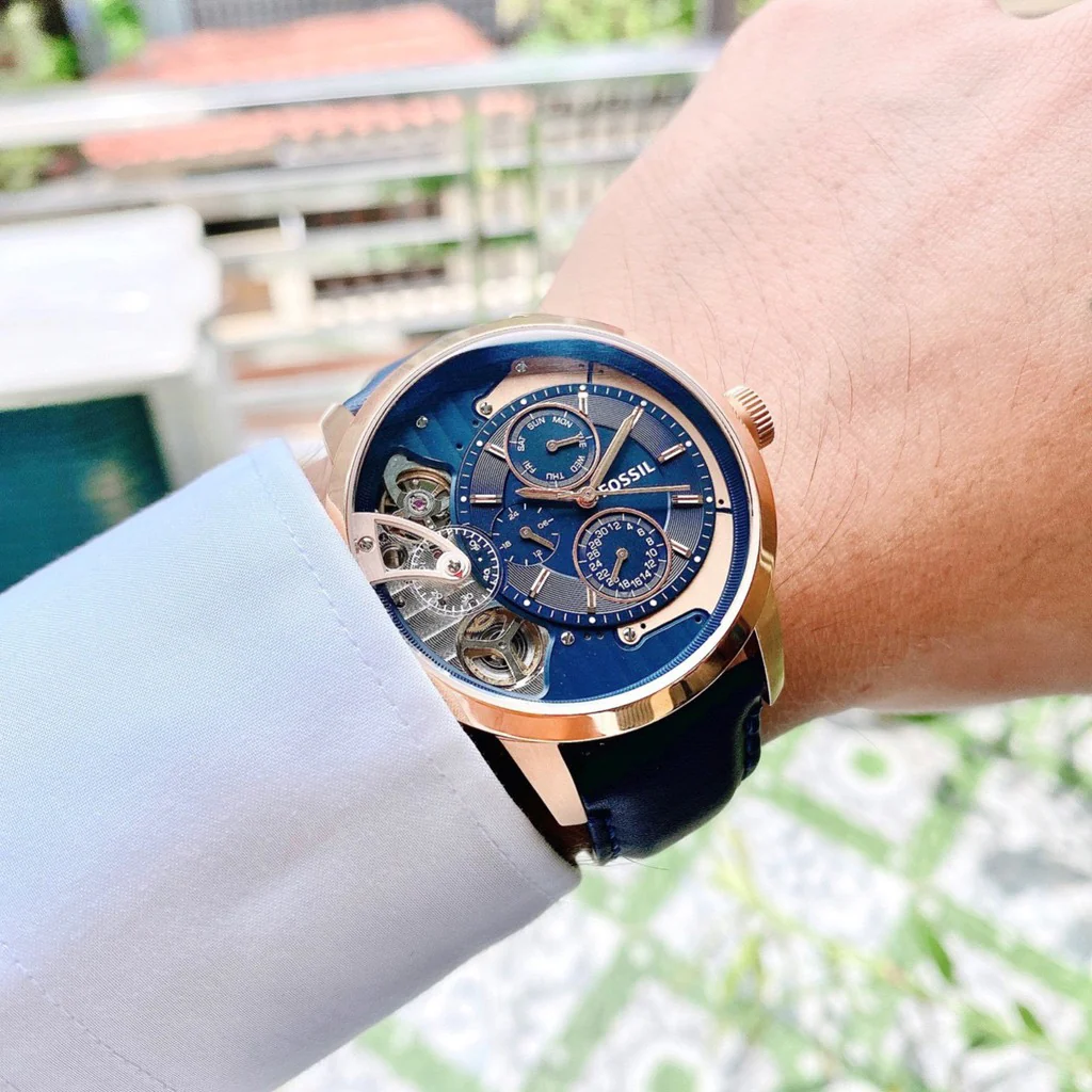 Discover the intricate workings of the Fossil Townsman Twist Skeleton Blue Dial Watch for Men. The captivating blue leather strap and blue dial reveal the inner mechanics of the watch, providing both style and functionality. A must-have for any watch enthusiast, this timepiece will elevate any outfit.