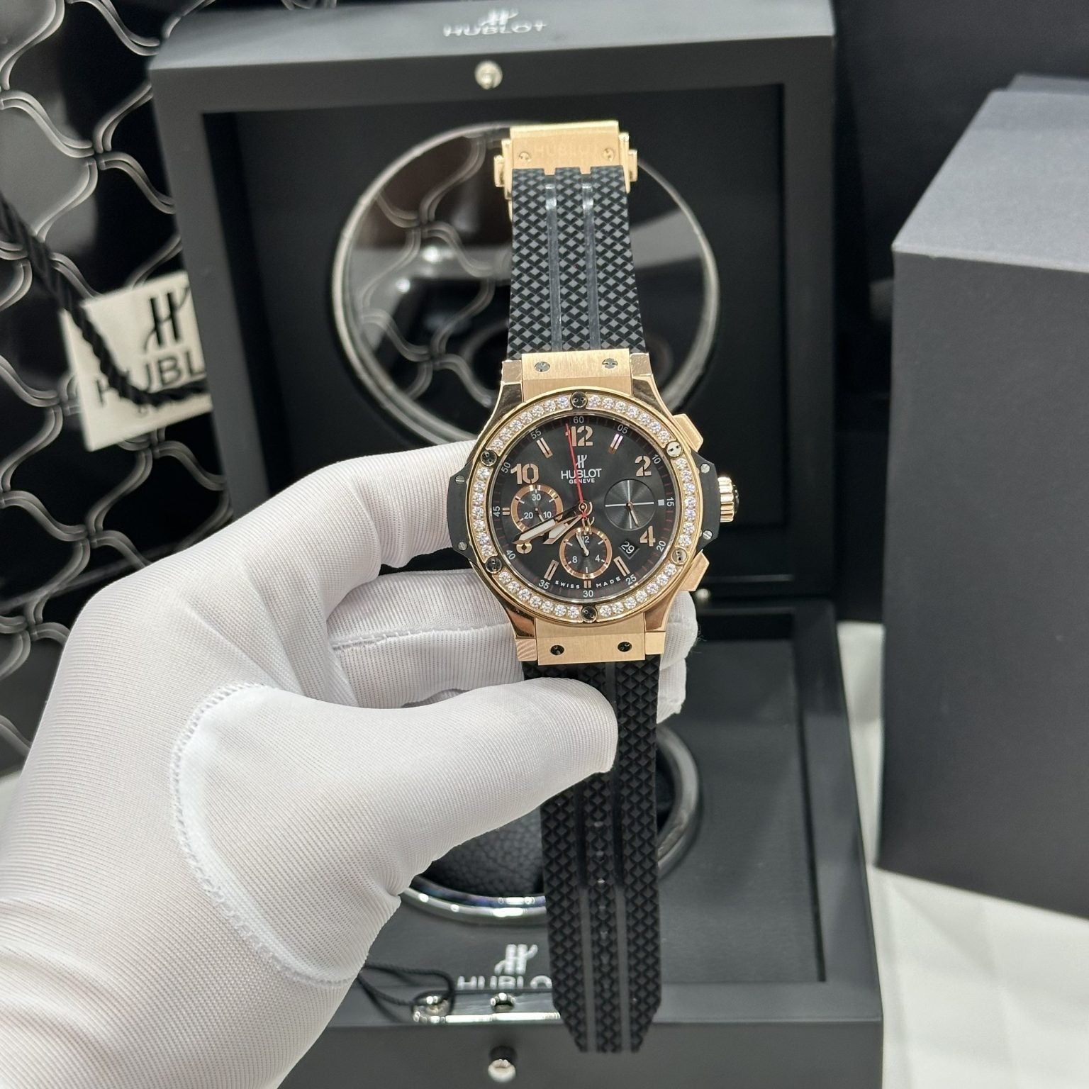 Hublot 1:1 Swiss Watch Big Bang Chronograph King Gold Bezel Diamonds 44mm