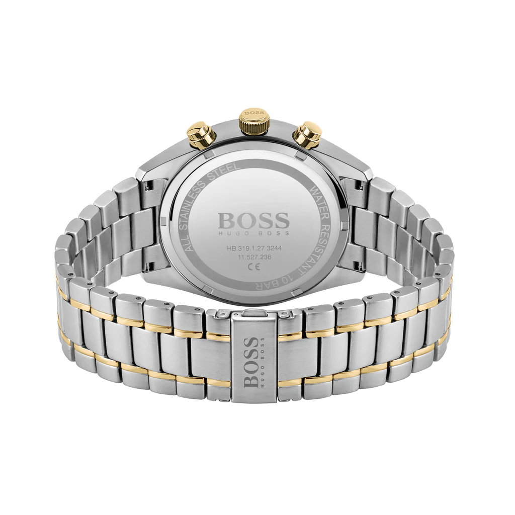 This Hugo Boss watch has a stainless steel case 44mm in diameter and is fitted with a metal strap. Inside the case lies a movement and the watch features a mineral crystal. The watch is 5ATM. This means the watch is suitable for showering.