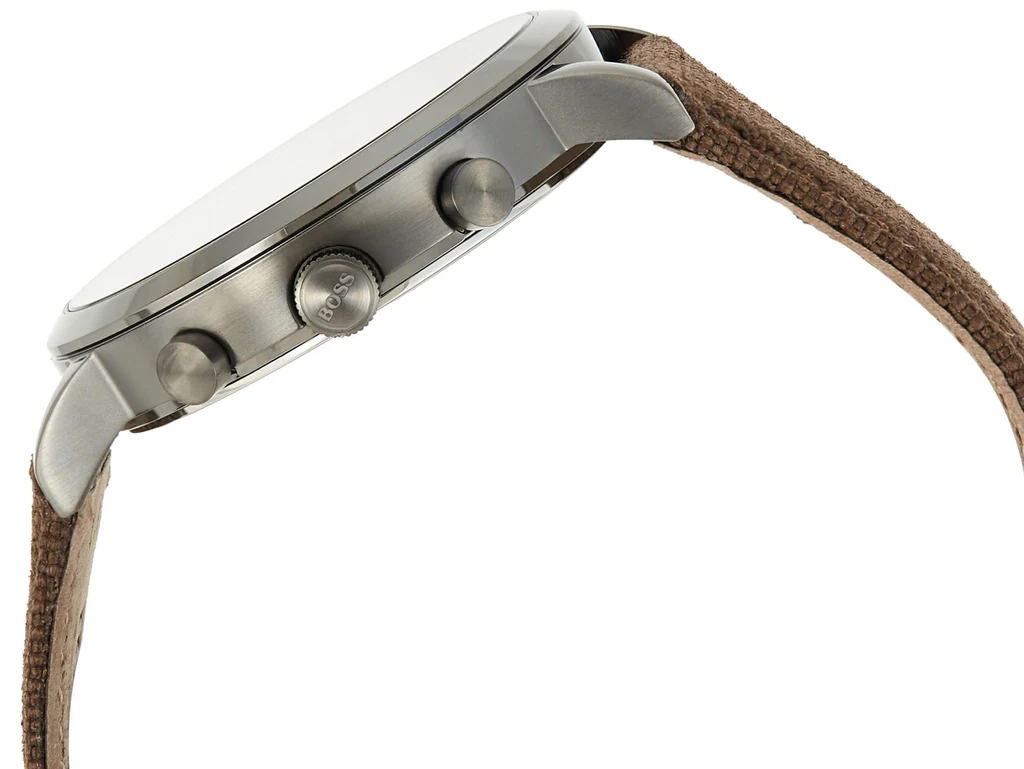 BRAND, SELLER, OR COLLECTION NAMEBOSSMODEL NUMBER1513690PART NUMBER1513690ITEM SHAPERoundDIAL WINDOW MATERIAL TYPEMineralDISPLAY TYPEAnalogCLASPTang BuckleCASE MATERIALStainless SteelCASE DIAMETER42 millimetersCASE THICKNESS10 millimetersBAND MATERIALLeatherBAND SIZEMens StandardBAND WIDTH20 millimetersBAND COLORBrownDIAL COLORSilverMOVEMENTQuartz