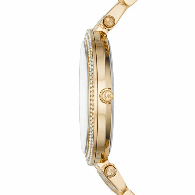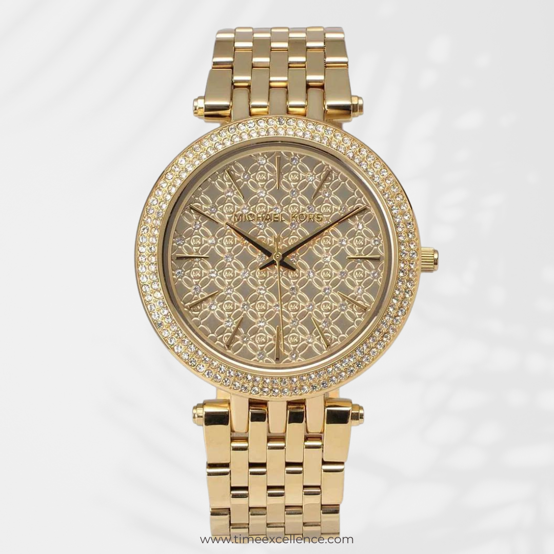 A beautiful 7-link bracelet and a sparkling crystal top ring define the gold-tone stainless steel Michael Kors Darci watch. An intricate Michael Kors logo pattern details the dial for a sophisticated finishing touch.