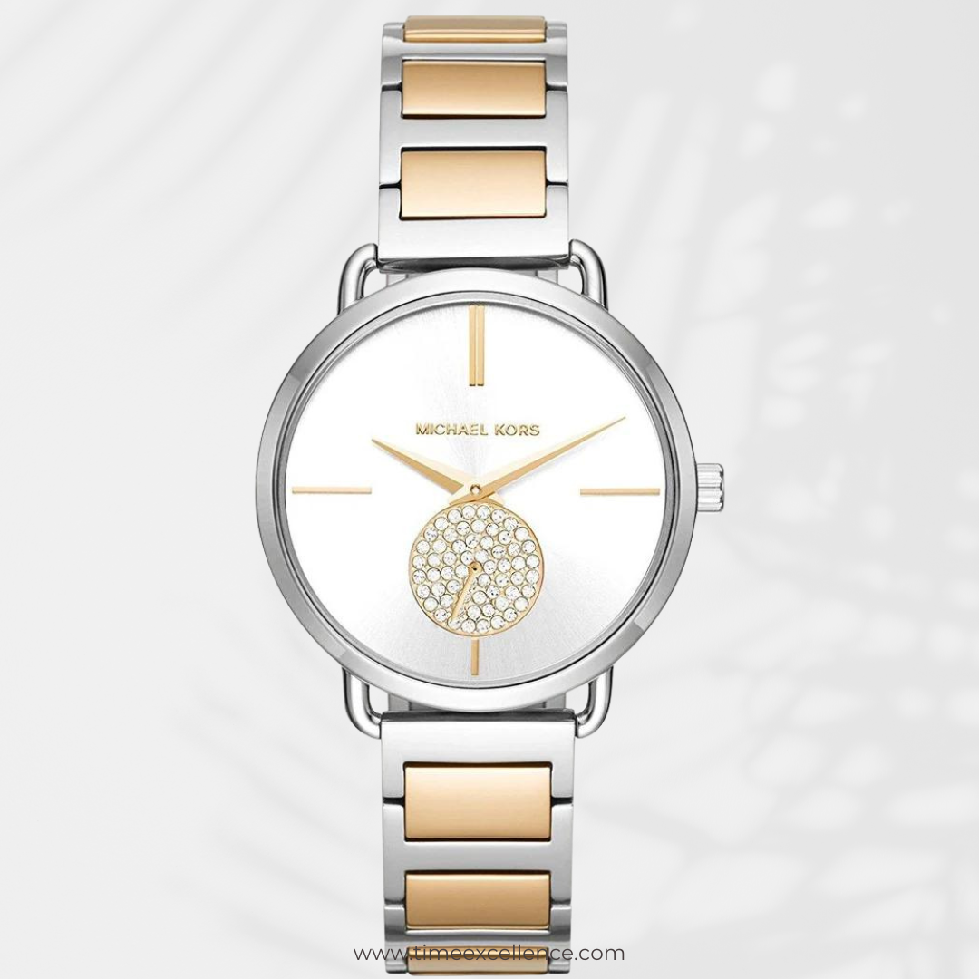 The Michael Kors Portia watch is the face of sleek, modern chic. A minimalist silver sunray dial with gold-tone stick indexes and pave crystal sixty-second sub-dial shines against a stainless-steel case and two-tone H-link bracelet.