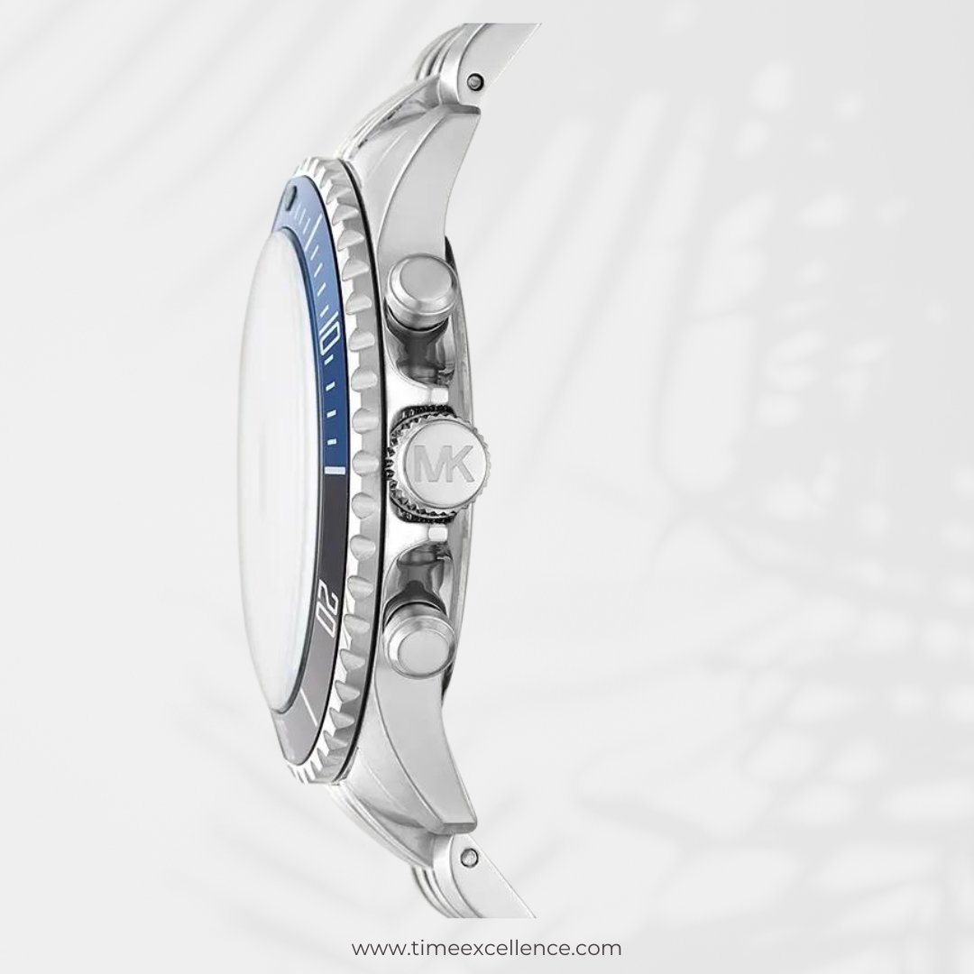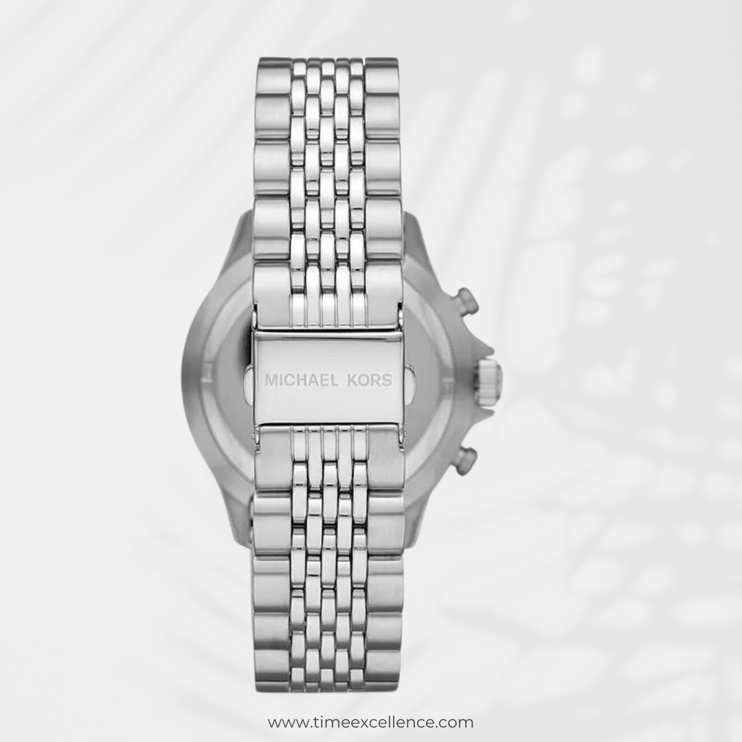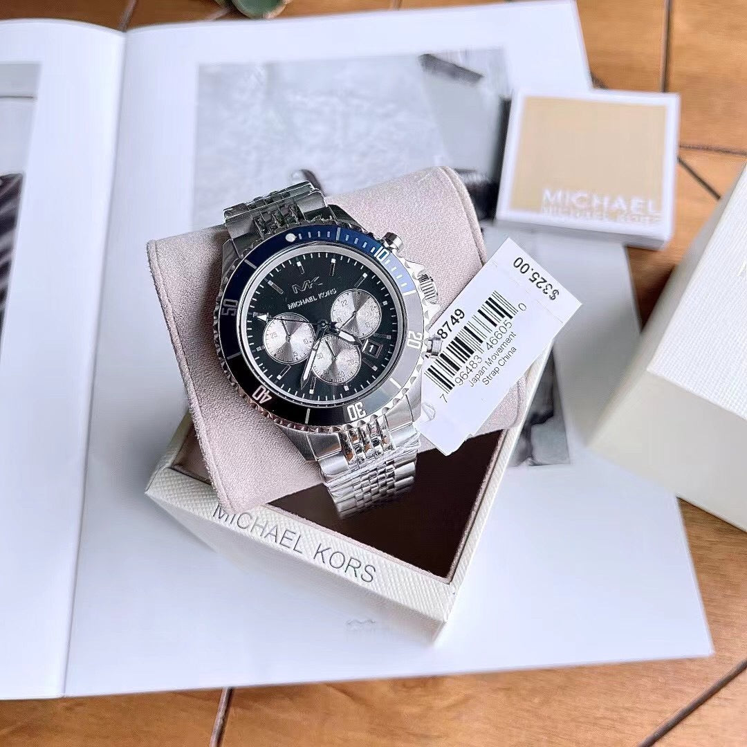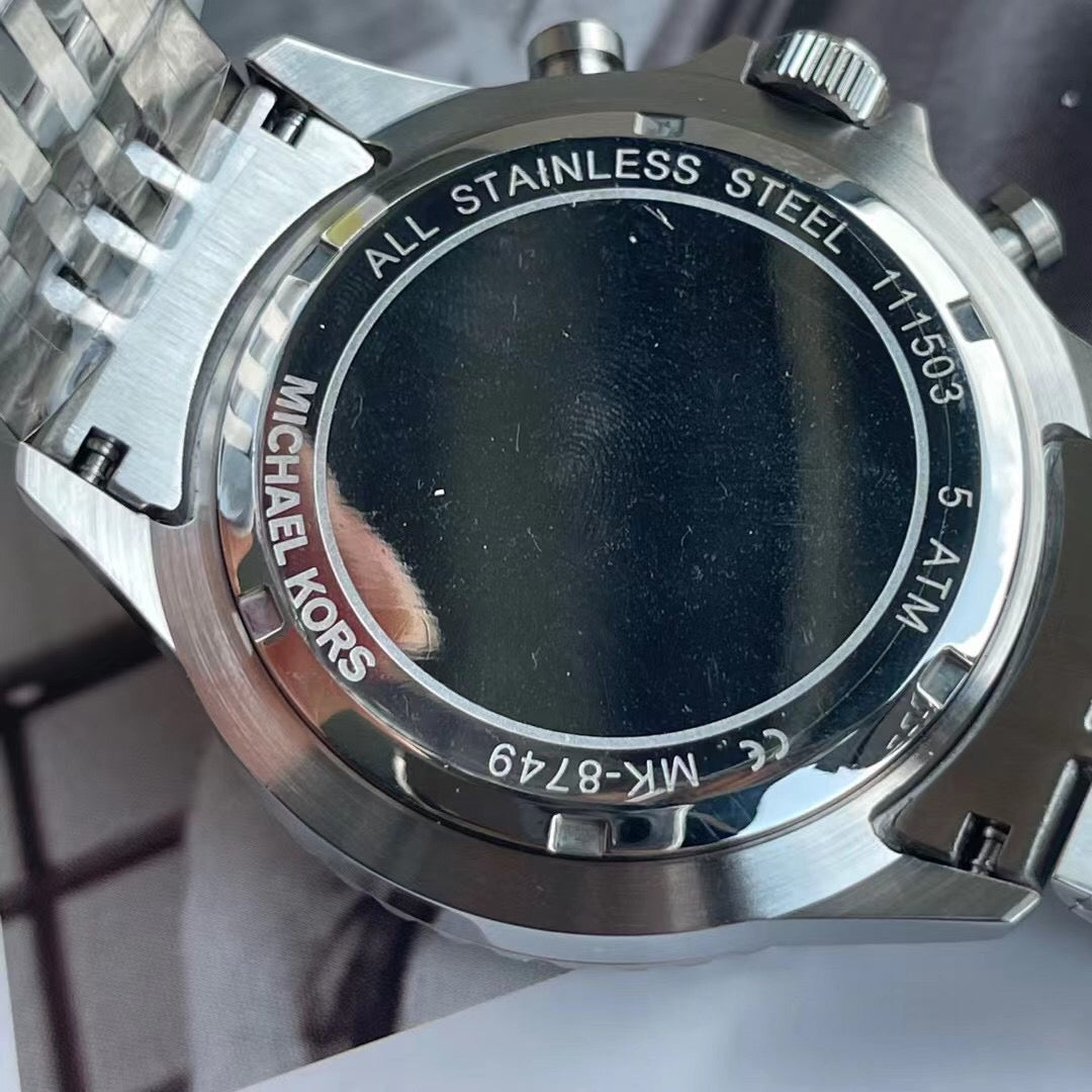 Brand: Michael Kors, Series: Bayville, Gender: Men's, Model: MK8749, Movement: Quartz, Case Size: 44mm, Dial Color: Black, Case Thickness: 11mm, Case Material: Stainless Steel, Case Shape: Round, Case Back: Solid, Band Material: Stainless Steel, Band Type: Bracelet, Band Color: Silver, Band Width: 22mm, Clasp: Fold Over with Push Button Release, Crystal: Scratch Resistant Mineral, Bezel: Unidirectional Rotating, Bezel Color: Silver-tone, Bezel Material: Stainless Steel, Crown: Pull / Push, Water Resistant: 50 Meters / 165 Feet, Functions: Chronograph, Date, Hour, Minute, Second, Watch Style: Casual