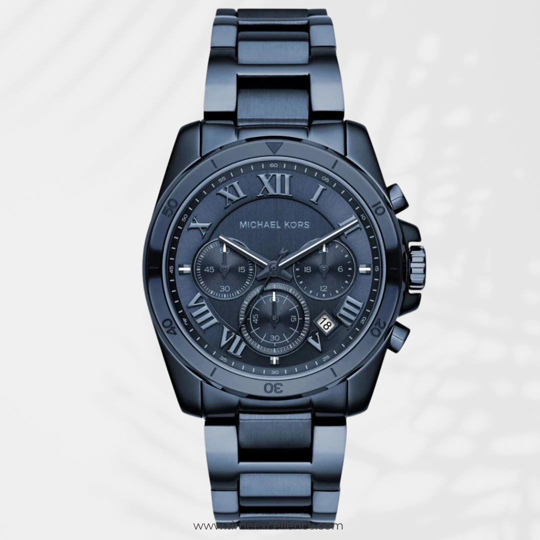 The Michael Kors, Brecken series features a navy blue ion-plated stainless steel 40mm case, with a fixed navy blue ion-plated bezel, a navy blue dial and a scratch resistant mineral crystal.