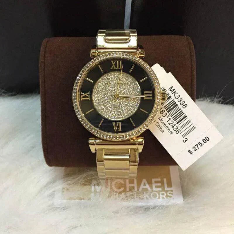 Michael Kors Catlin Black Dial Gold Steel Strap Watch For Women - MK3338