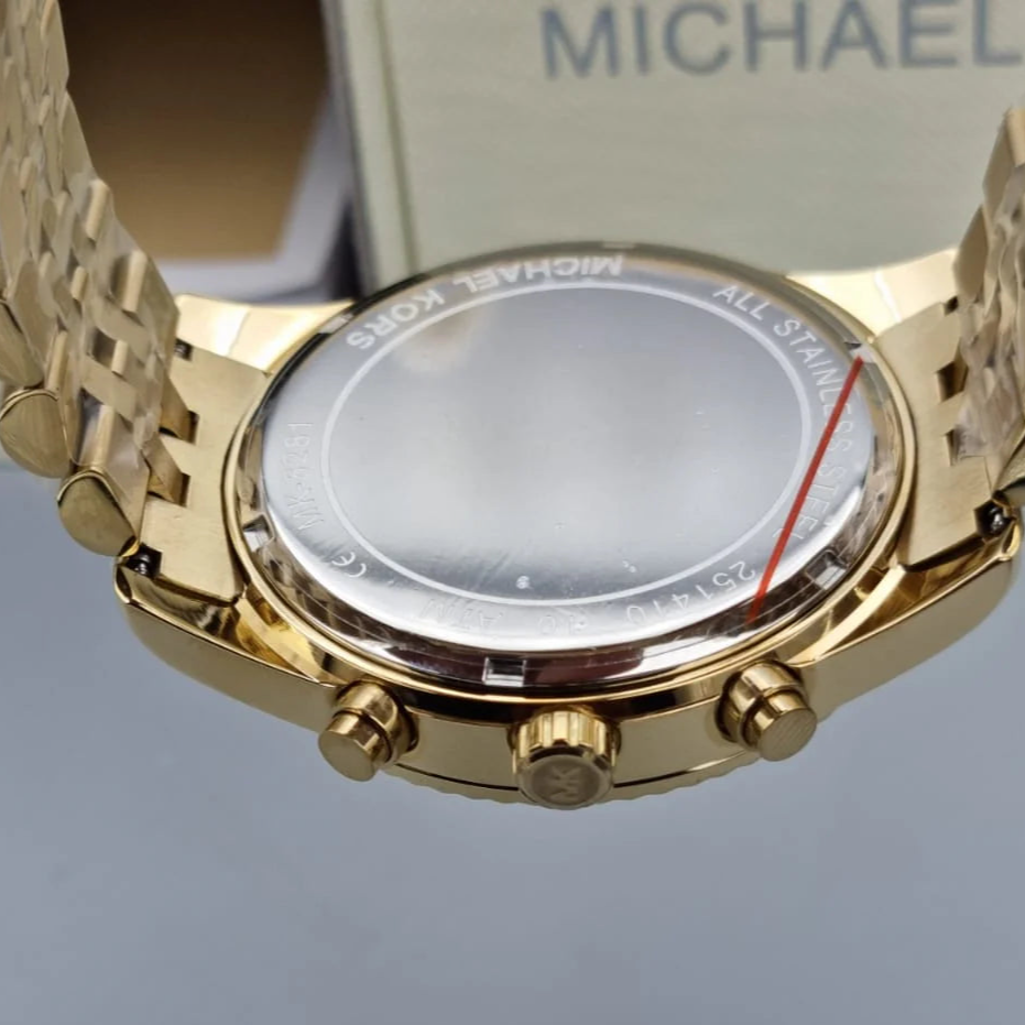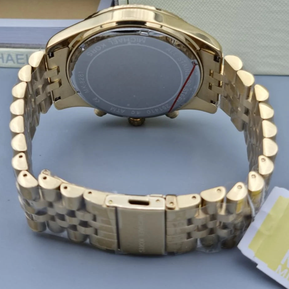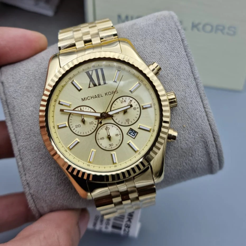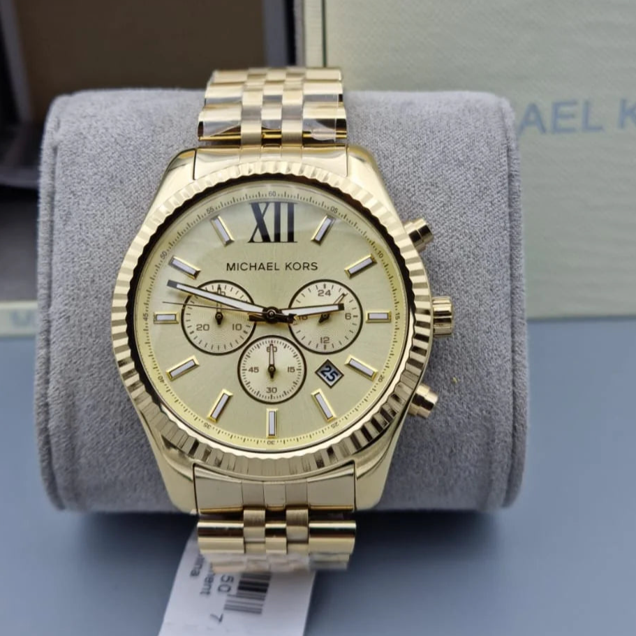 Brand: Michael Kors, Series: Lexington, Gender: Men's, Model: MK8281, Movement: Quartz, Case Size: 44mm, Dial Color: Champagne, Case Thickness: 13mm, Case Material: Stainless Steel, Case Shape: Round, Case Back: Solid, Band Material: Stainless Steel, Band Type: Bracelet, Band Color: Yellow Gold-tone, Band Width: 22mm, Clasp: Fold Over with Push Button Release, Crystal: Scratch Resistant Mineral, Bezel: Fixed, Bezel Color: Yellow Gold-tone, Bezel Material: Stainless Steel, Crown: Pull / Push, Water Resistant: 100 Meters / 330 Feet, Functions: Date, Hour, Minute, Second, Watch Style: Fashion