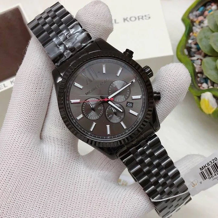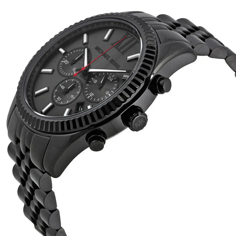 Black-plated stainless steel case and bracelet. Fixed black-plated bezel. Black dial with silver-tone hands and index hour markers. Roman numeral marks the 12 o'clock position. Minute markers around the outer rim. Dial Type: Analog. Date display between 4 and 5 o'clock positions. Chronograph - three sub-dials displaying: 60 second, 30 minute and 24 hour. Quartz movement. Scratch resistant mineral crystal. Pull / push crown. Solid case back. Case diameter: 45 mm. Round case shape. Band width: 22 mm. Deployment clasp. Water resistant at 100 meters / 330 feet. Casual watch style. Michael Kors All Black Large Lexington Chronograph Bracelet Watch MK8320.