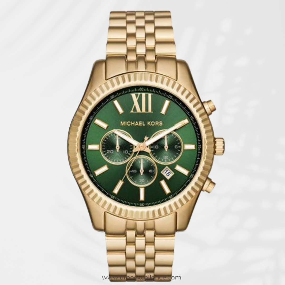 Michael Kors Lexington Chronograph Green Dial Gold Steel Strap Watch For Men - MK8446