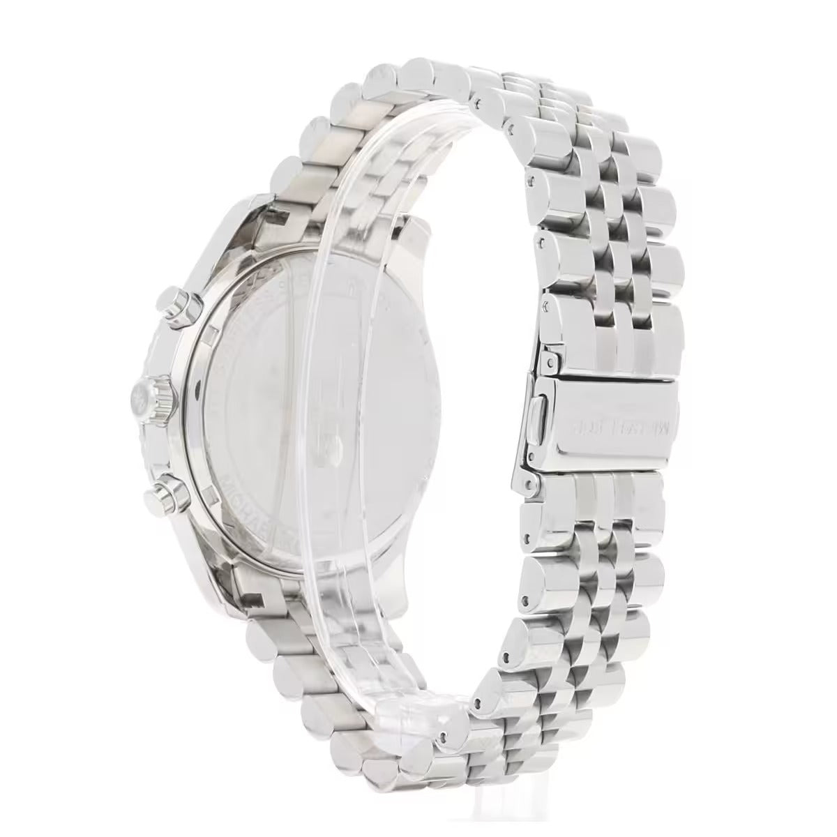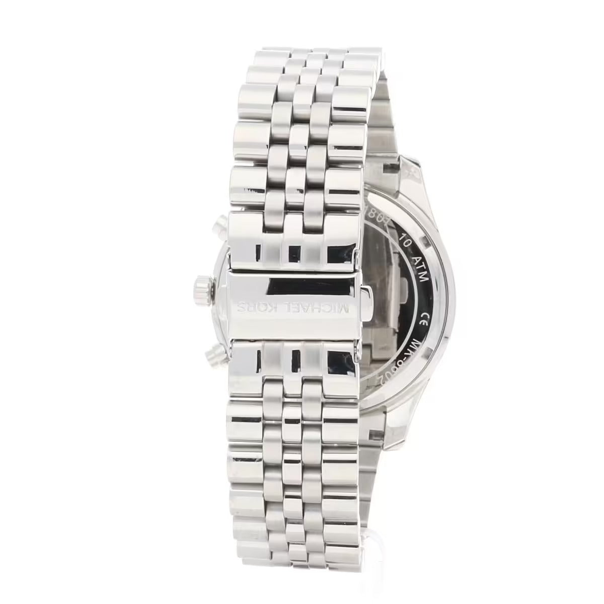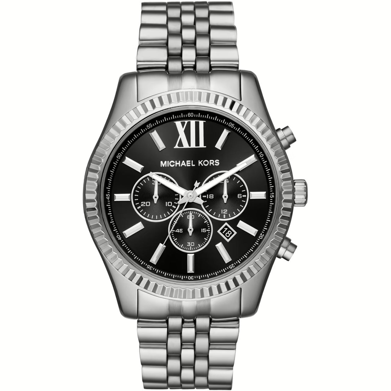 Chronograph Men's Watch By Michael Kors Of Lexington Collection. Model With Round Case In Stainless Steel Silver Color And Glossy Finish. Case Of Diameter Of 44 Mm And Of Thickness Of 13 Mm. The ring is made of silver-colored stainless steel with glossy finish, black dial and transparent glass. Watch With Silver Stainless Steel Bracelet With Polished Finish And Deployment Clasp. The Distance Of The Bends Is 22 Mm. Clock With Quartz Movement With Chronograph And Water Resistance Of 10 Atm. The reference is Mk8602Features chronograph MK8602 Michael Kors