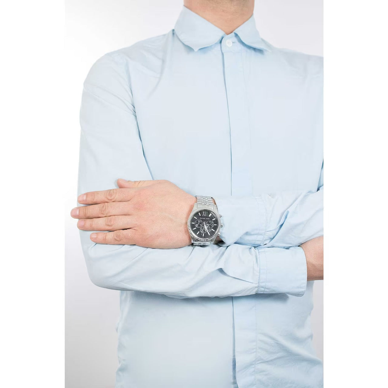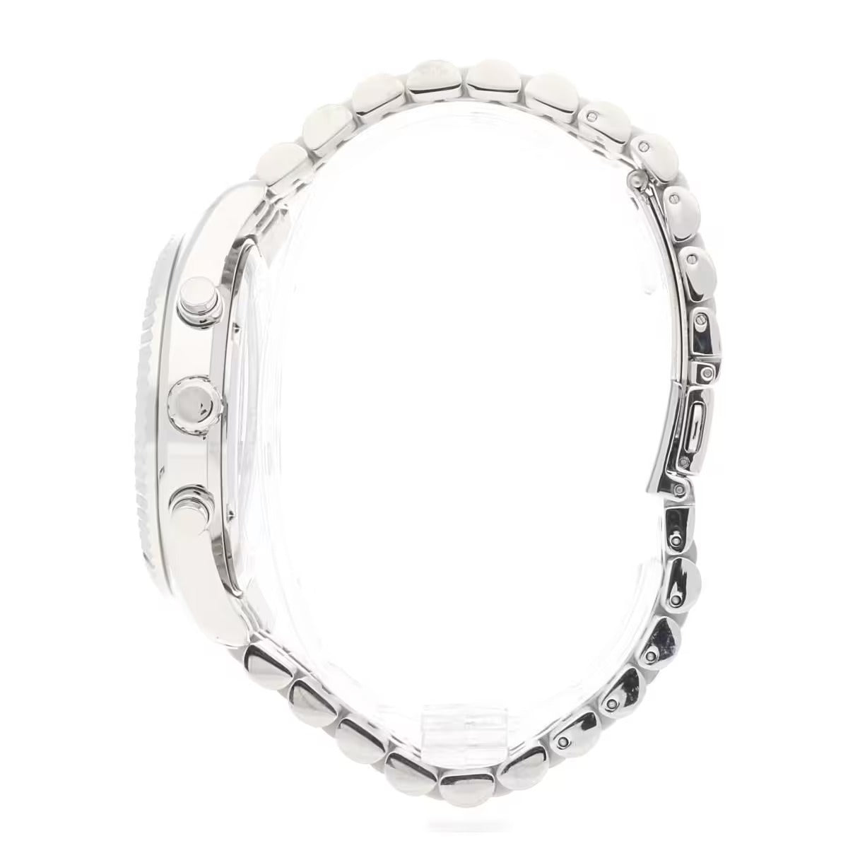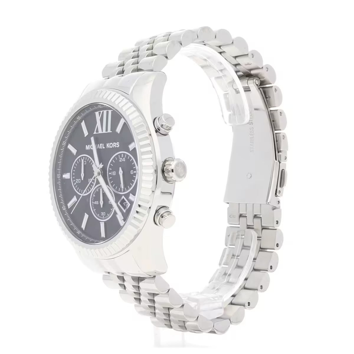 Chronograph Men's Watch By Michael Kors Of Lexington Collection. Model With Round Case In Stainless Steel Silver Color And Glossy Finish. Case Of Diameter Of 44 Mm And Of Thickness Of 13 Mm. The ring is made of silver-colored stainless steel with glossy finish, black dial and transparent glass. Watch With Silver Stainless Steel Bracelet With Polished Finish And Deployment Clasp. The Distance Of The Bends Is 22 Mm. Clock With Quartz Movement With Chronograph And Water Resistance Of 10 Atm. The reference is Mk8602Features chronograph MK8602 Michael Kors