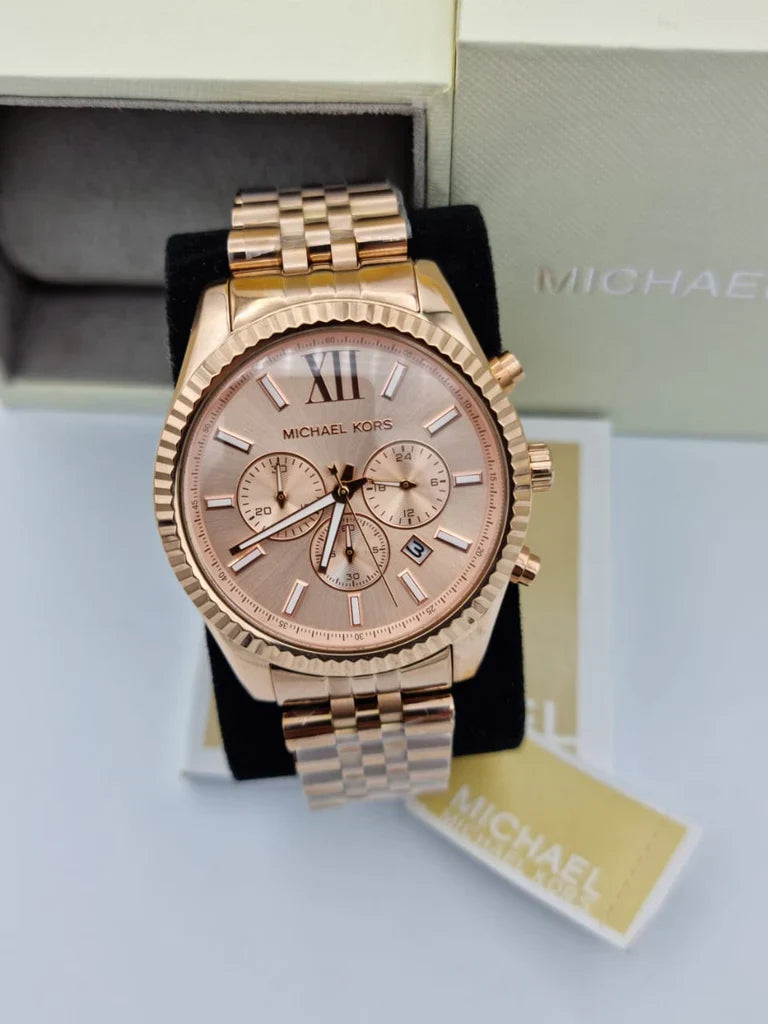 A stunning textural topring adds eye-catching appeal to the rose gold-tone stainless steel Michael Kors MK8319 Lexington chronograph watch. It features a rose gold-tone dial with luminous hands and index hour markers, fixed bezel and a rose gold-plated stainless steel case and bracelet. Quartz movement with analog display. Chronograph - three sub-dials. Scratch-resistant mineral crystal. Solid case back.  Men's Lexington Rose Gold Stainless Steel Chronograph Micheal Kors Watch MK8319 Rose Gold-Tone Dial Rose Gold-Plated Stainless Steel  Three Sub-Dial Scratch Resistant