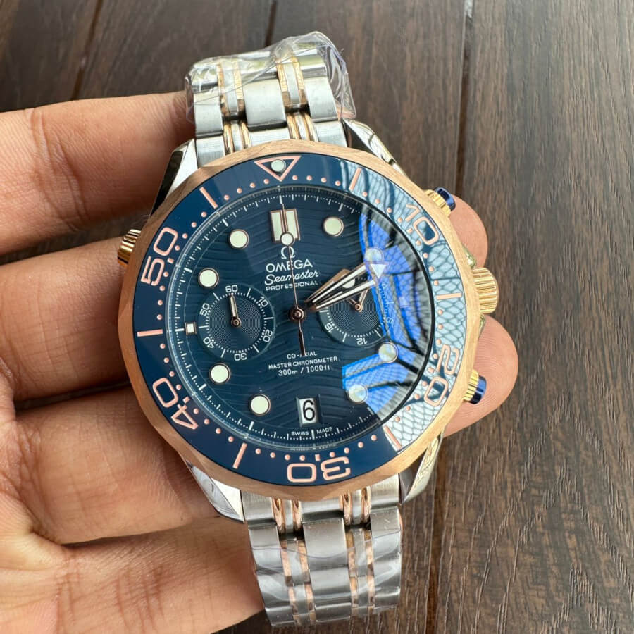 The Omega Seamaster 300M Diver Blue Dial Dual Tone Watch is a refined timepiece, showcasing a striking blend of blue hues and dual-tone elements.
