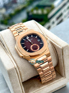 Patek Philippe Nautilus Annual Calendar 42 mm Gold & Brown Brand: Patek Philippe Model: Nautilus Gender: Men Movement: Automatic Case Size: 42mm Case back:Transparent Thickness: 10 mm Case Material: 306 L Stainless Steel Bezel: 306 L Stainless Steel Case color:Rose gold Dial Color: Brown Band Type: Stainless steel rose gold Clasp: Fold clasp 2 years warranty