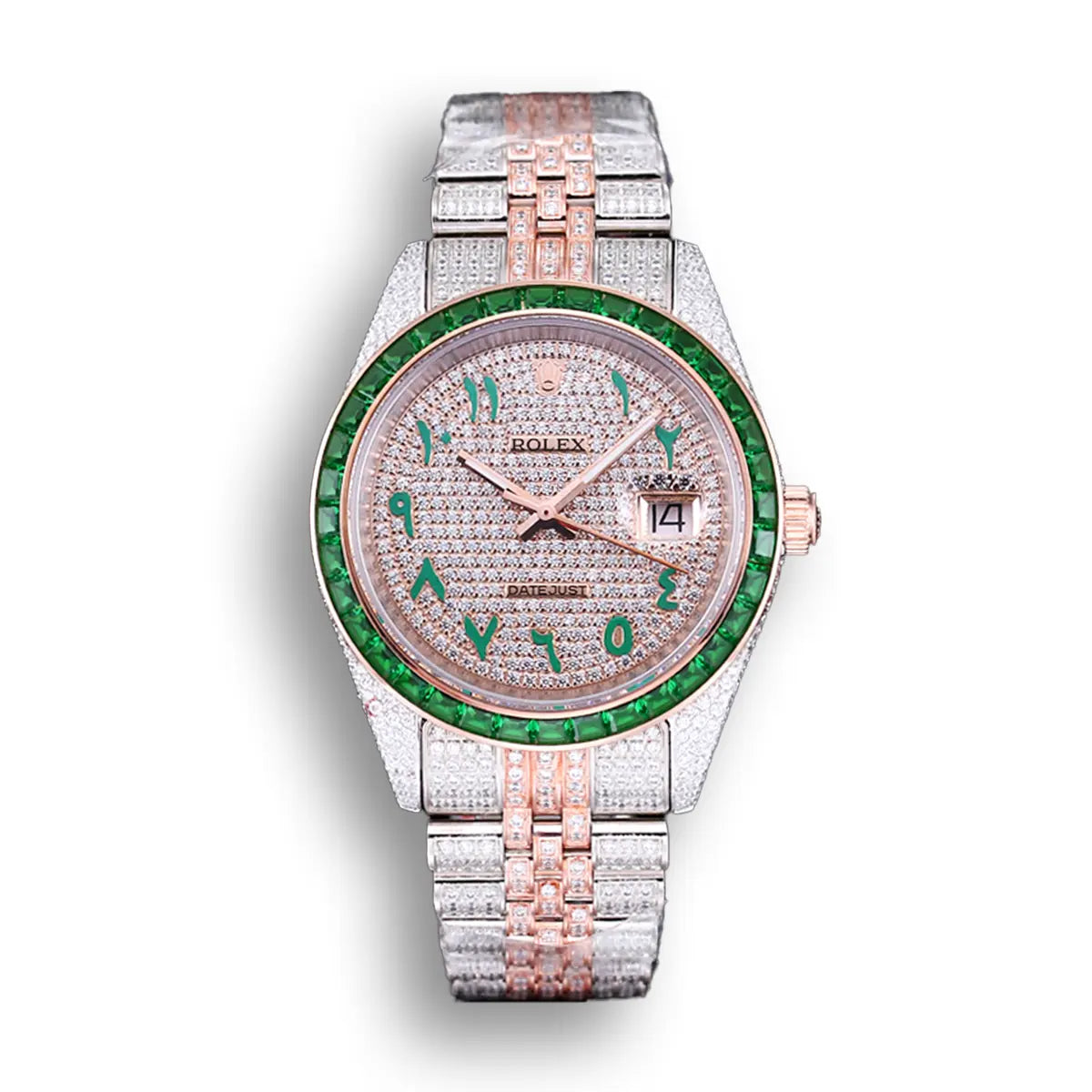 Bold expression of luxury and workmanship, the Rolex Datejust Ref. 126300 41mm Arabic Dial Full-Diamond Green Bezel Its 41mm case combined with a green diamond-set bezel makes a striking visual impact guaranteed to turn heads.
