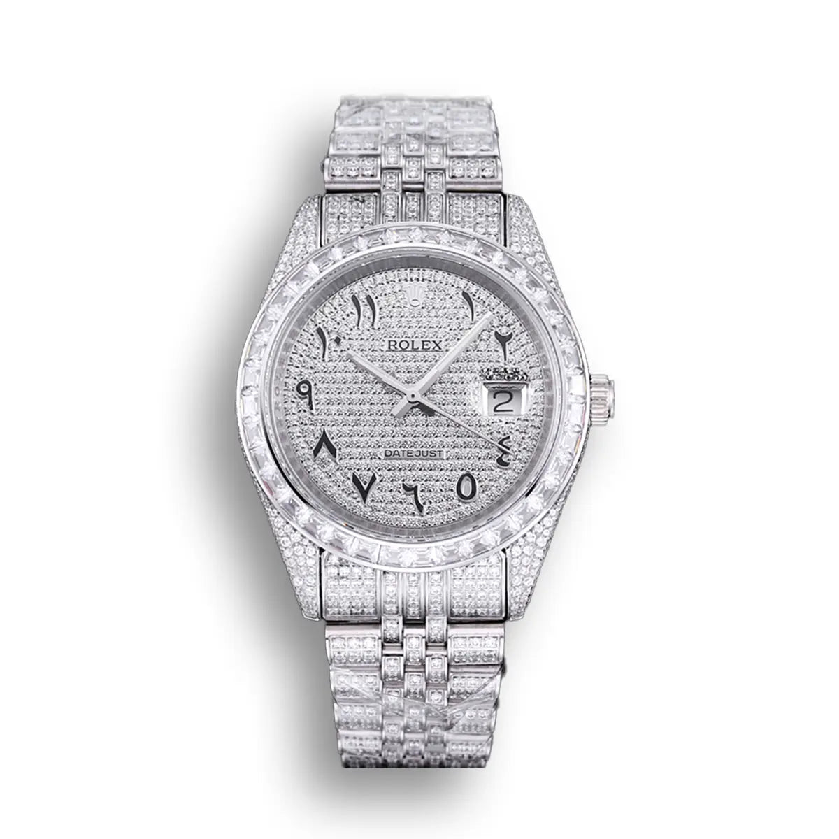 Presenting the Rolex Datejust Ref. 126300, a watch with its full-diamond dial covered with Arabic numerals redefines luxury. For those looking for elegance with a cultural touch, this special mix of classic Arabic lettering and modern luxury makes it an outstanding work.