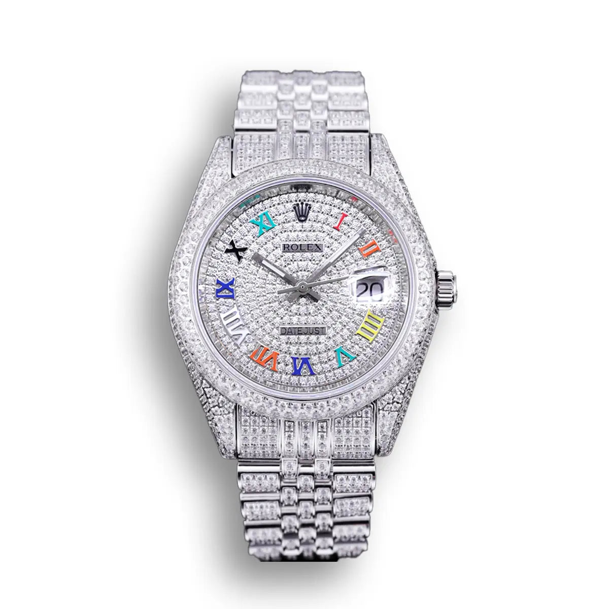 The Rolex Datejust Ref. 126300 is a stunning timepiece. Its 41mm case size is perfect for most wrists. The watch face is adorned with diamonds, making it truly brilliant. The traditional look of the dial comes from its Roman numerals. This watch is ideal for anyone who appreciates a blend of contemporary and traditional styles.