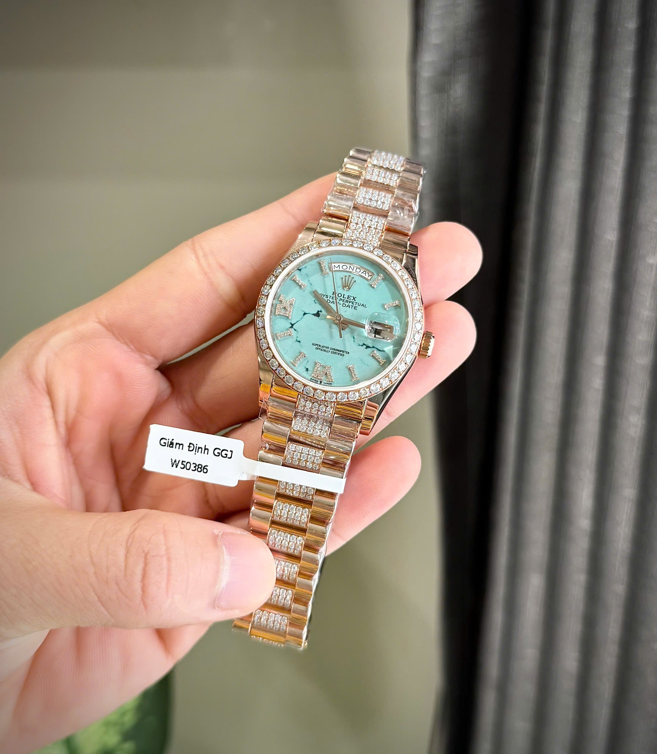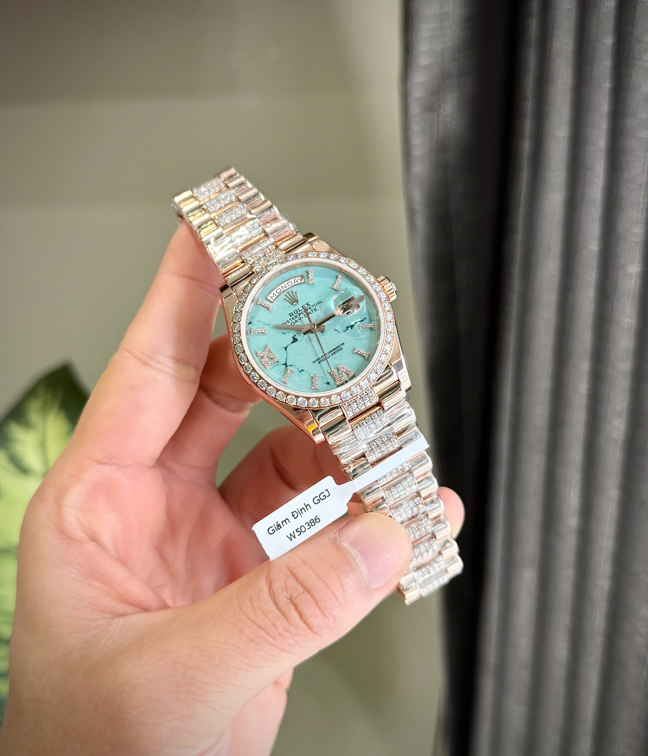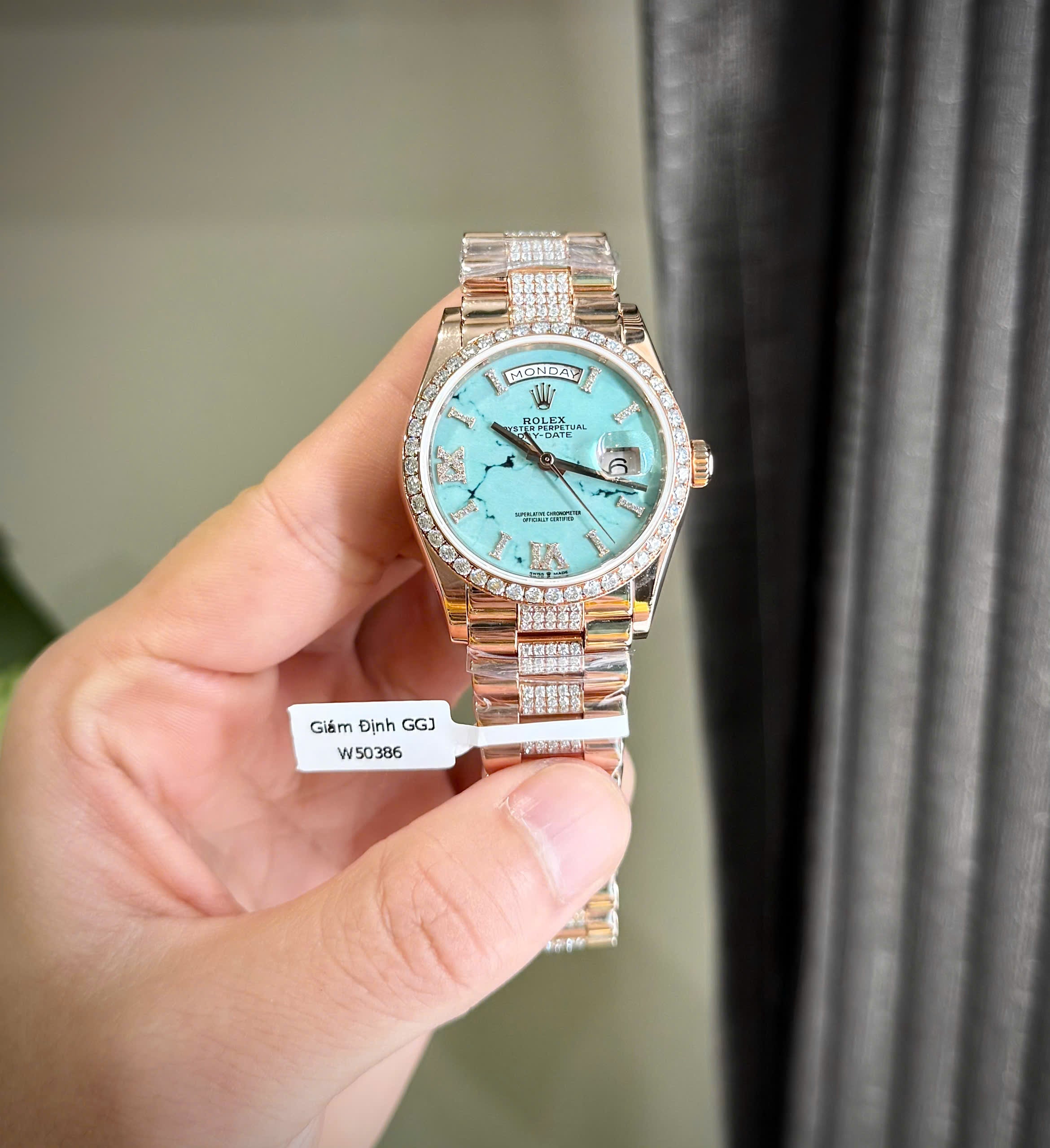 Rolex Day-Date 128345RBR Turquoise Dial Gold Wrapped with Moissanite Diamonds 36mm