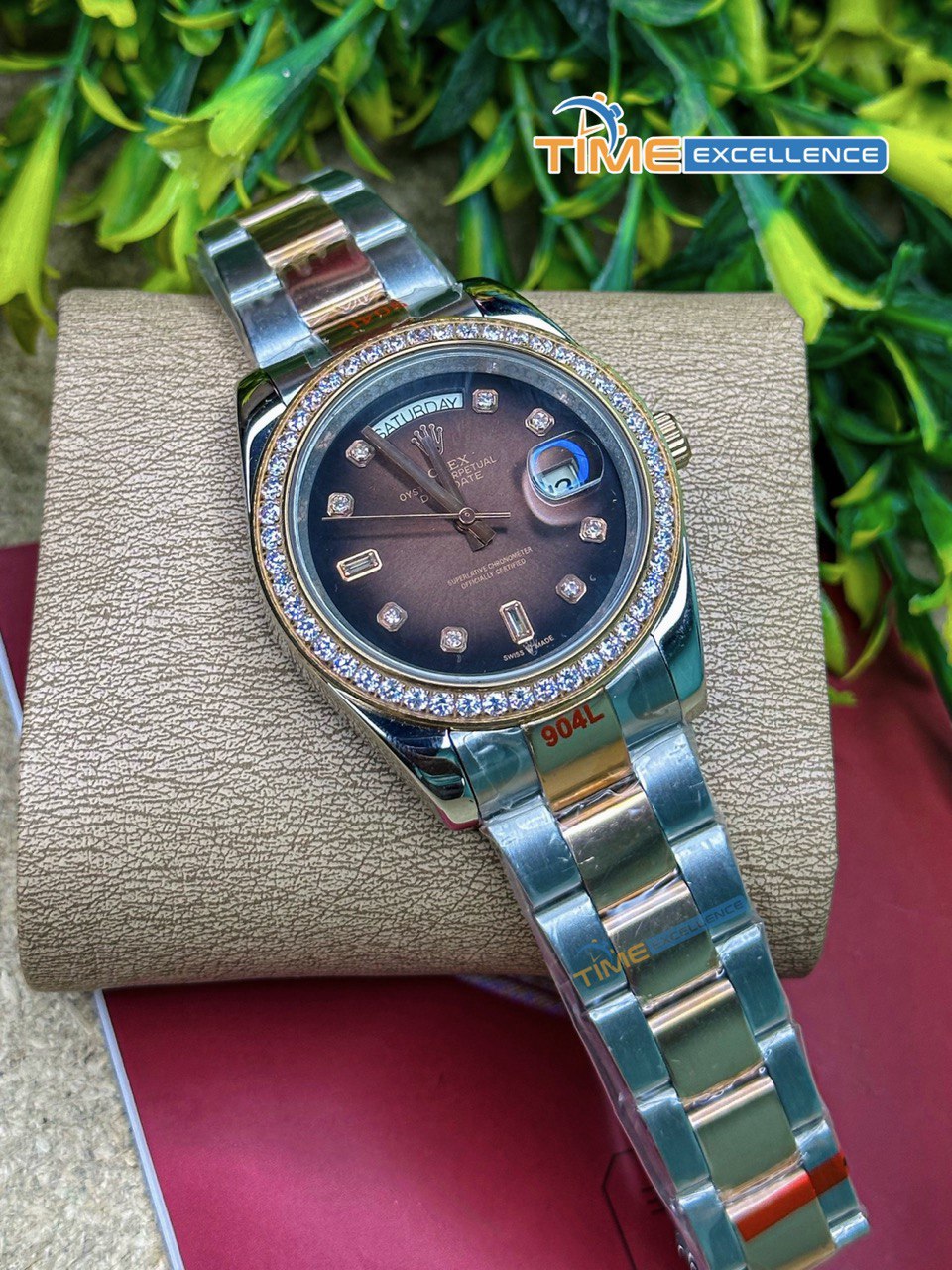 Rolex Day-Date Cofee Dial Rose Gold Diamond Case Two Tone roestvrij stalen armband Master Grade