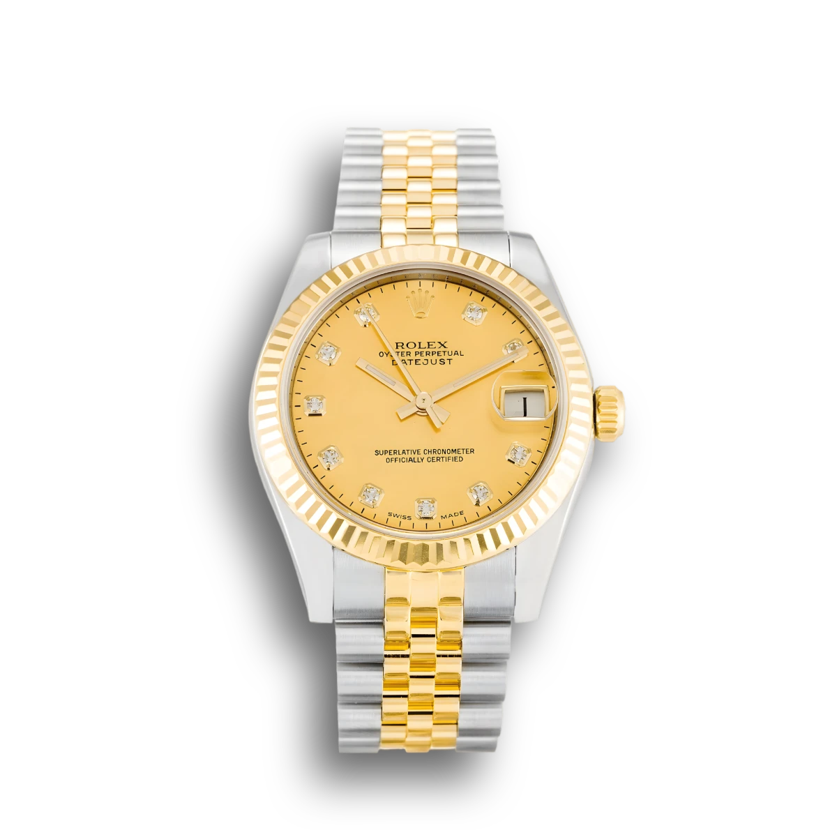 Encased in a 31mm stainless steel and yellow gold fusion, the watch boasts a captivating champagne dial that exudes a warm and inviting charm.