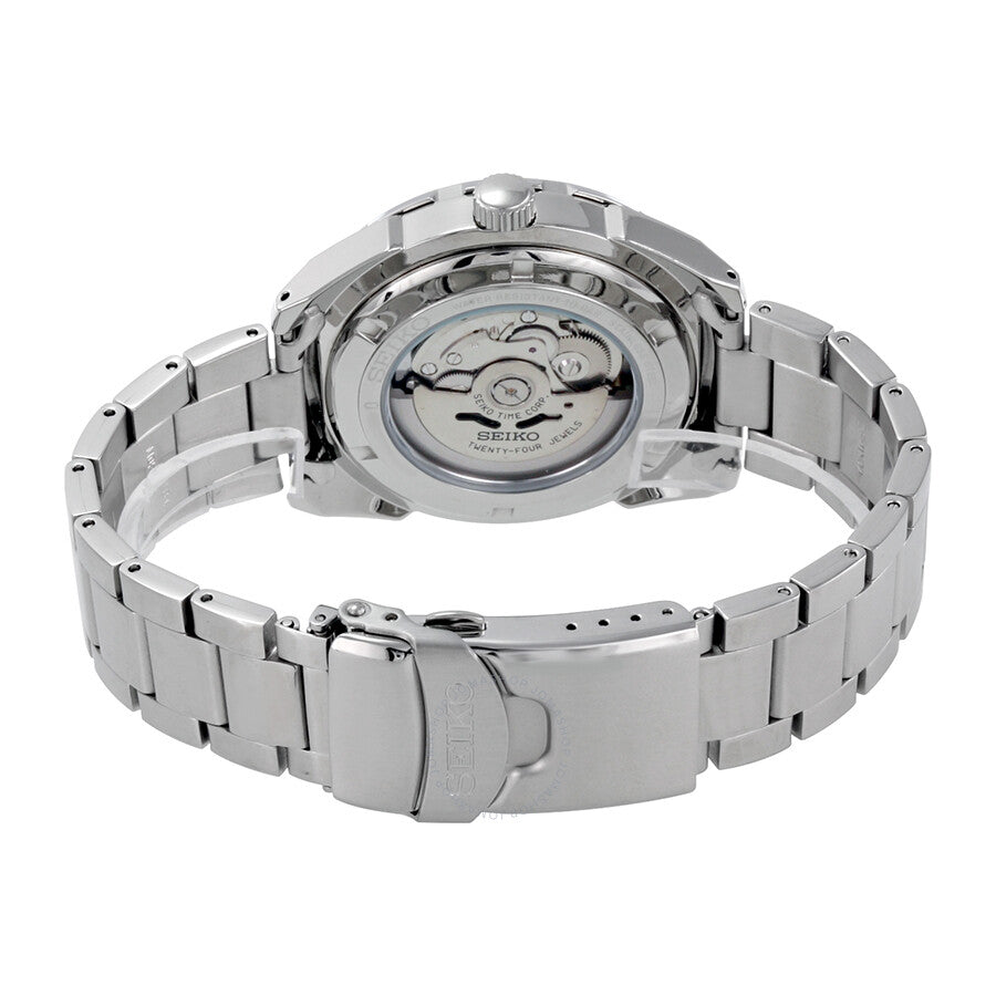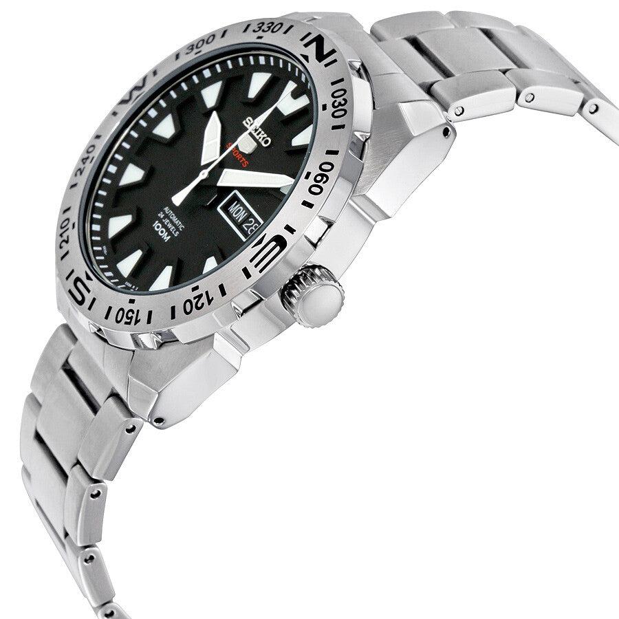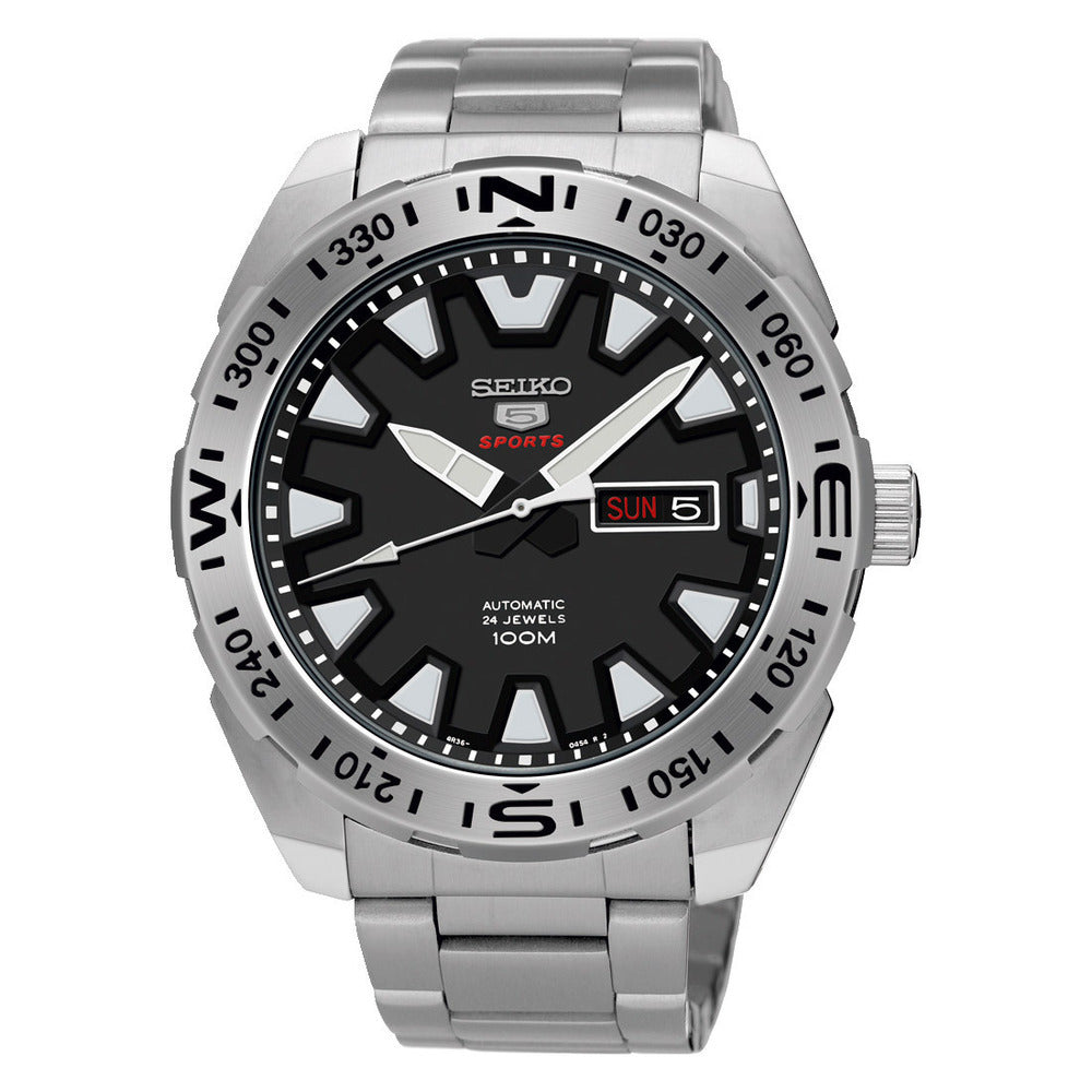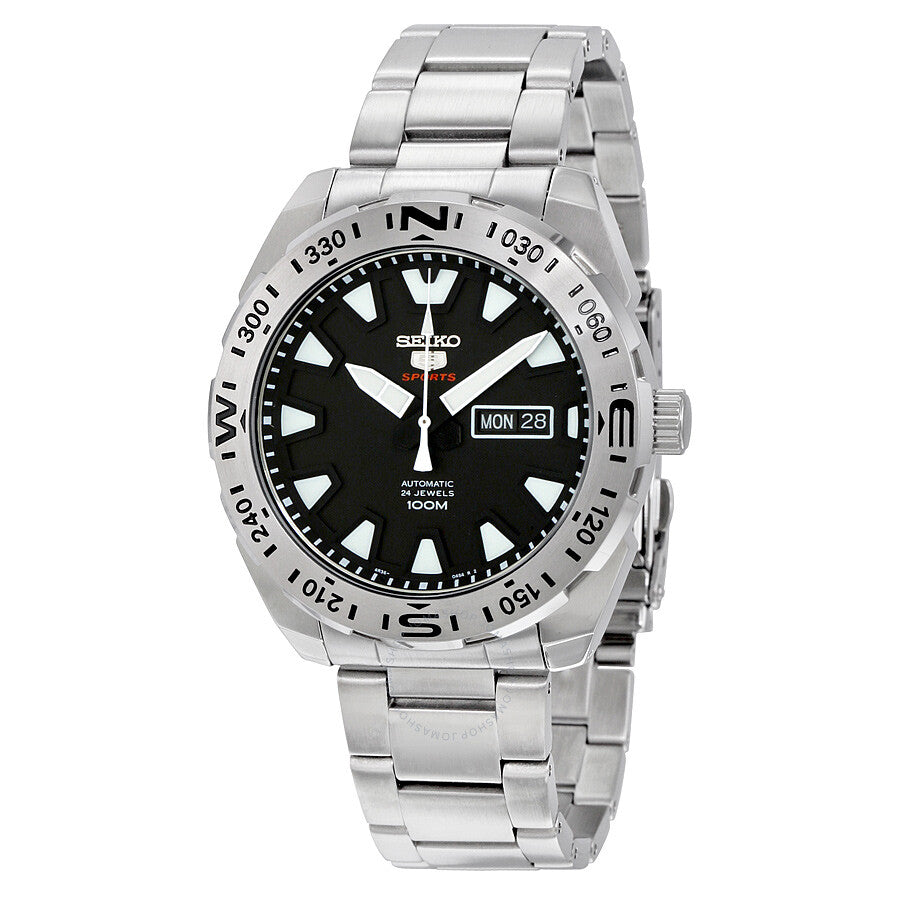Stainless steel case with a stainless steel bracelet. Bi-directional rotating stainless steel bezel showing compass markings . Black dial with luminous hands and index hour markers. Minute markers around the outer rim. Dial Type: Analog. Luminescent hands and markers. Day of the week and date display at the 3 o'clock position. Automatic movement with a 40-hour power reserve. Scratch resistant mineral crystal. Transparent case back. Case diameter: 45 mm. Case thickness: 13 mm. Round case shape. Band width: 22 mm. Fold over clasp with double push button release. Water resistant at 100 meters / 330 feet. Functions: date, day, hour, minute, second, compass. Casual watch style. Seikoo 5 Sports Black Dial Stainless Steel Men's Watch SRP739.