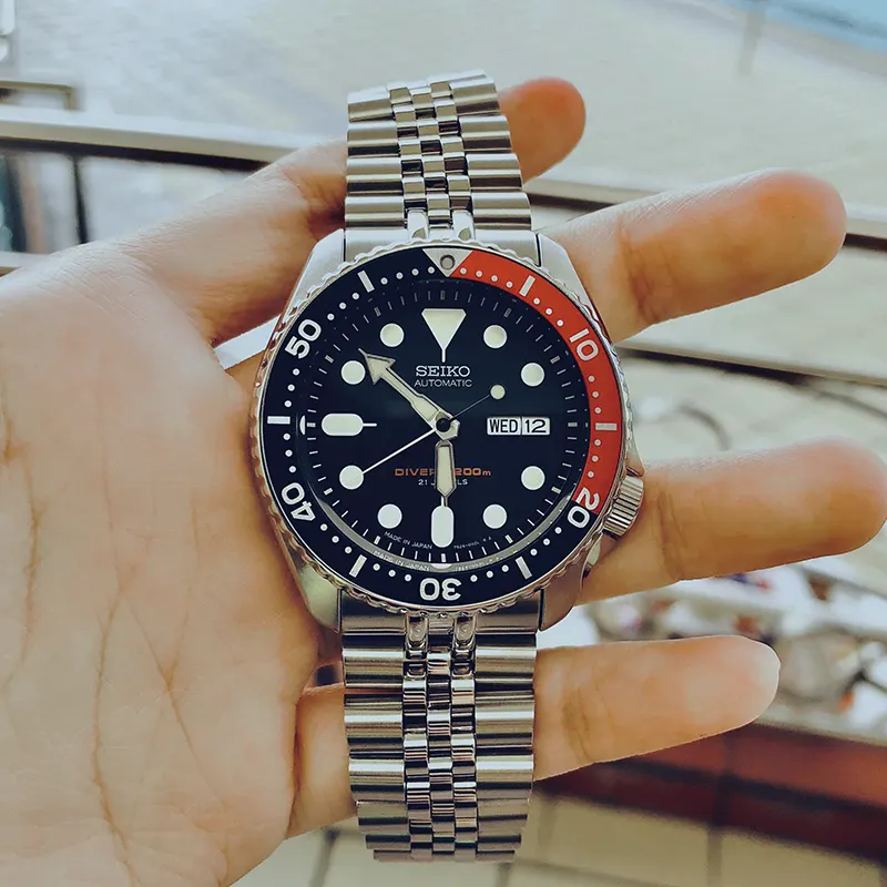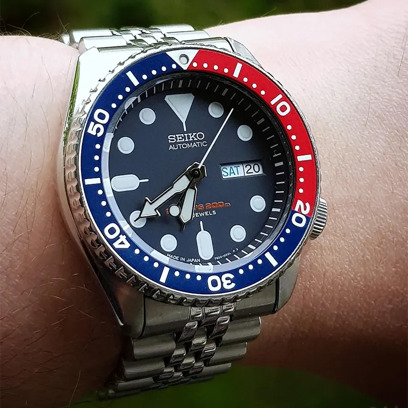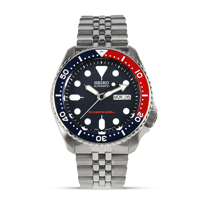 The Seiko Prospex Diver's 200M Automatic Blue Dial Men'sWatch (SKX009J) is a classic timepiece that exemplifies Seiko's dedication to precision and durability. Designed for men, this model features the reliable 7S26 automatic movement housed in a 42.5mm stainless steel case, with a thickness of 13.5mm. The dark blue dial is equipped with lumed markers (using green LumiBrite) for clear visibility, especially in low light conditions.The watch comes with a solid stainless steel Jubilee bracelet in a silver-tone, measuring 22mm in width, and fastens securely with a fold-over clasp with safety. The uni-directional rotating bezel stands out with its iconic two-tone "Pepsi" design. Made from scratch-resistant Hardlex crystal, the watch is well-protected against damage. The screw-down crown and solid case back ensure a water resistance of up to 200 meters (660 feet), making it an ideal choice for diving. Additional functions include the day, date, hour, minute, and second hands, and the watch is backed by a 2-year international warranty. Available At Time Excellence