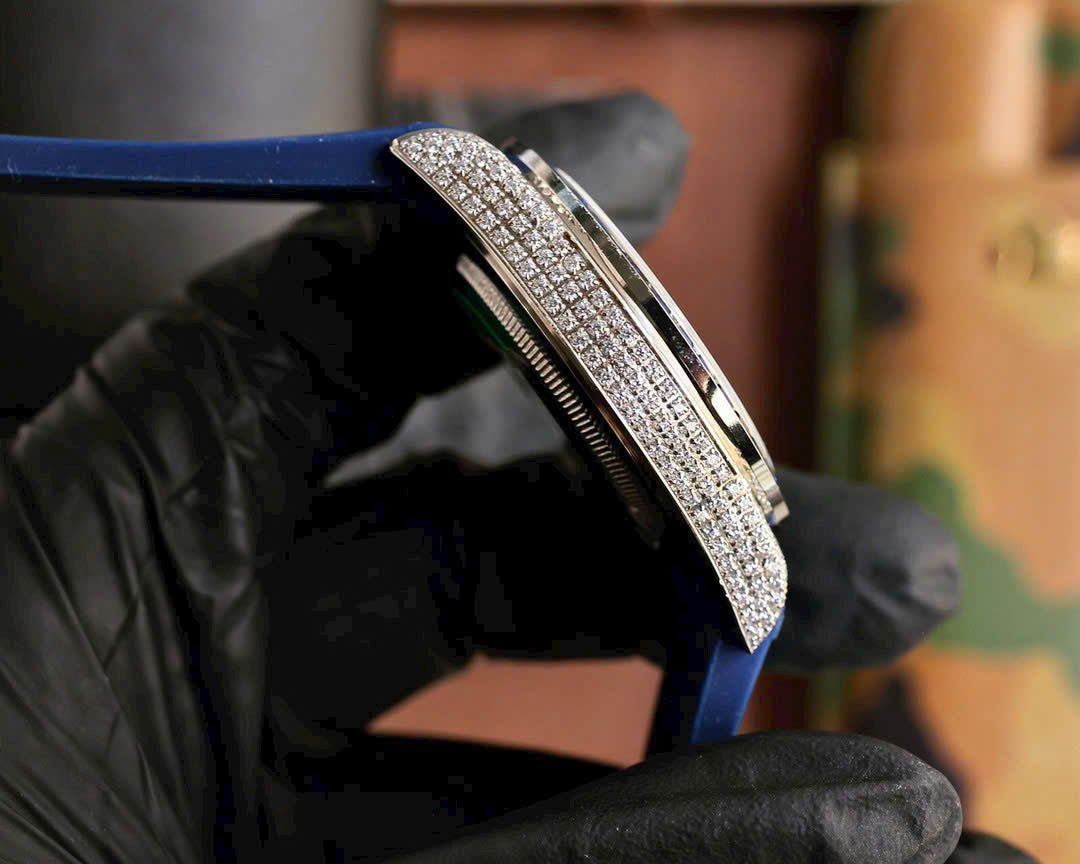 Rolex DateJust Swiss 1:1 Watches Full Diamonds Blue Sapphire Bezel Rubber Strap 41mm