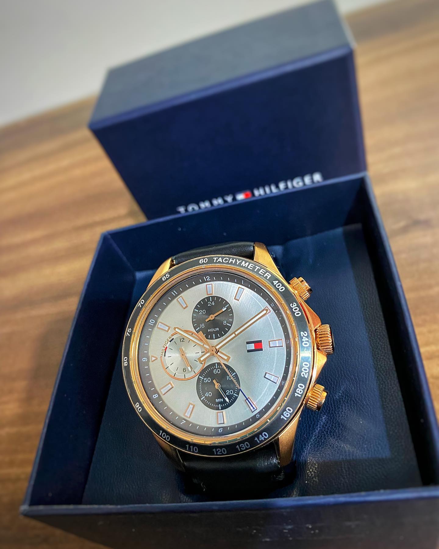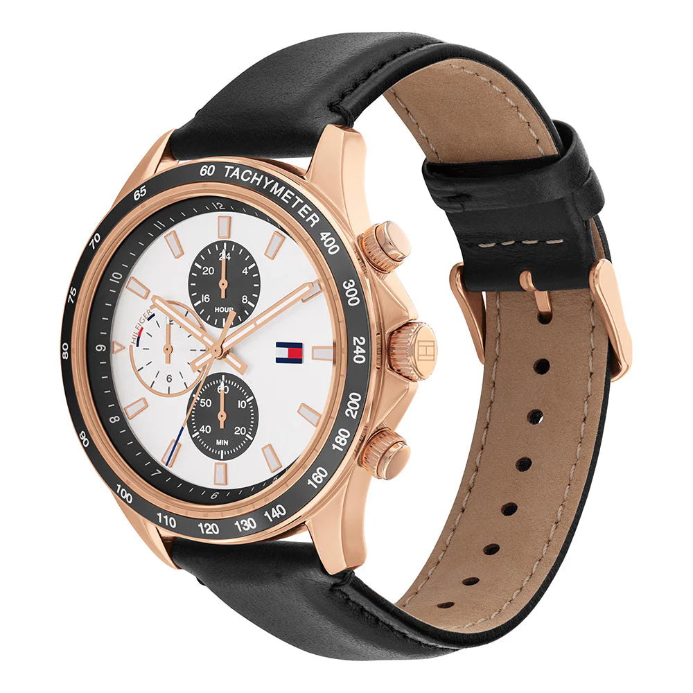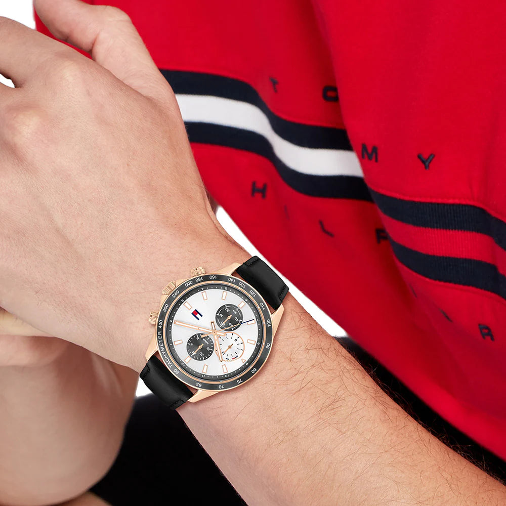 Step out in confidence with this stunning Tommy Hilfiger 1792016 Miles Black Leather Mens Watch. The bracelet features comfortable and versatile black leather that can be dressed up and down to suit any occasion, whether you are wearing it professionally or socially. The dial features a rose gold case and lugs with highlights on the hands and markers, meanwhile the bezel and chronograph are crafted in smooth black. A unique piece that has a sophisticated design, this watch is a real statement piece. If you’re looking for a larger piece that is stylish and elegant, then look no further than this Tommy Hilfiger piece.