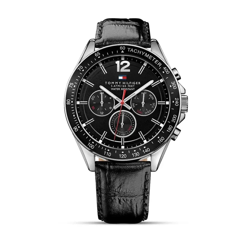 Brand: Tommy Hilfiger, Series: Luke, Gender: Men's, Model: 1791117, Movement: Quartz, Case Size: 47mm, Case Thickness: 12mm, Dial Color: Black, Case Material: Stainless Steel, Case Shape: Round, Case Back: Solid, Band Material: Leather, Band Type: Strap, Band Color: Black, Band Width: 22mm, Clasp: Tang, Crystal: Scratch Resistant Mineral, Bezel: Fixed, Bezel Color: Black, Bezel Material: Stainless Steel, Crown: Pull / Push, Water Resistance: 50 Meters / 165 Feet, Functions: Chronograph, Day, Date, Hour, Minute, Second, Watch Style: Dress