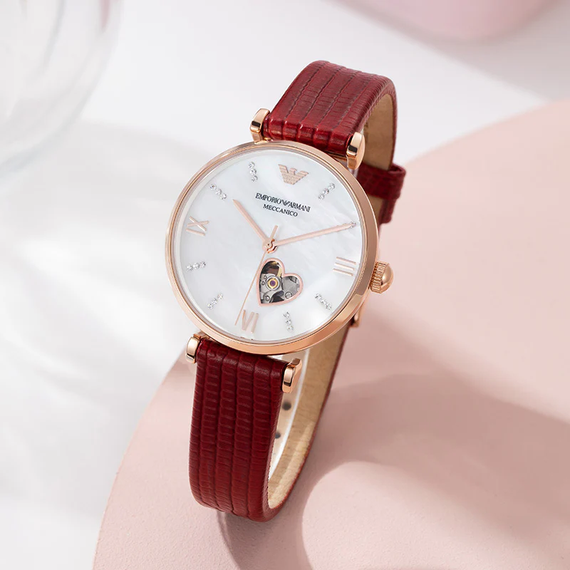 Emporio Armani's 34mm watch features a glossy white mother of pearl dial, open balance wheel with heart shape, automatic movement with and red leather strap.