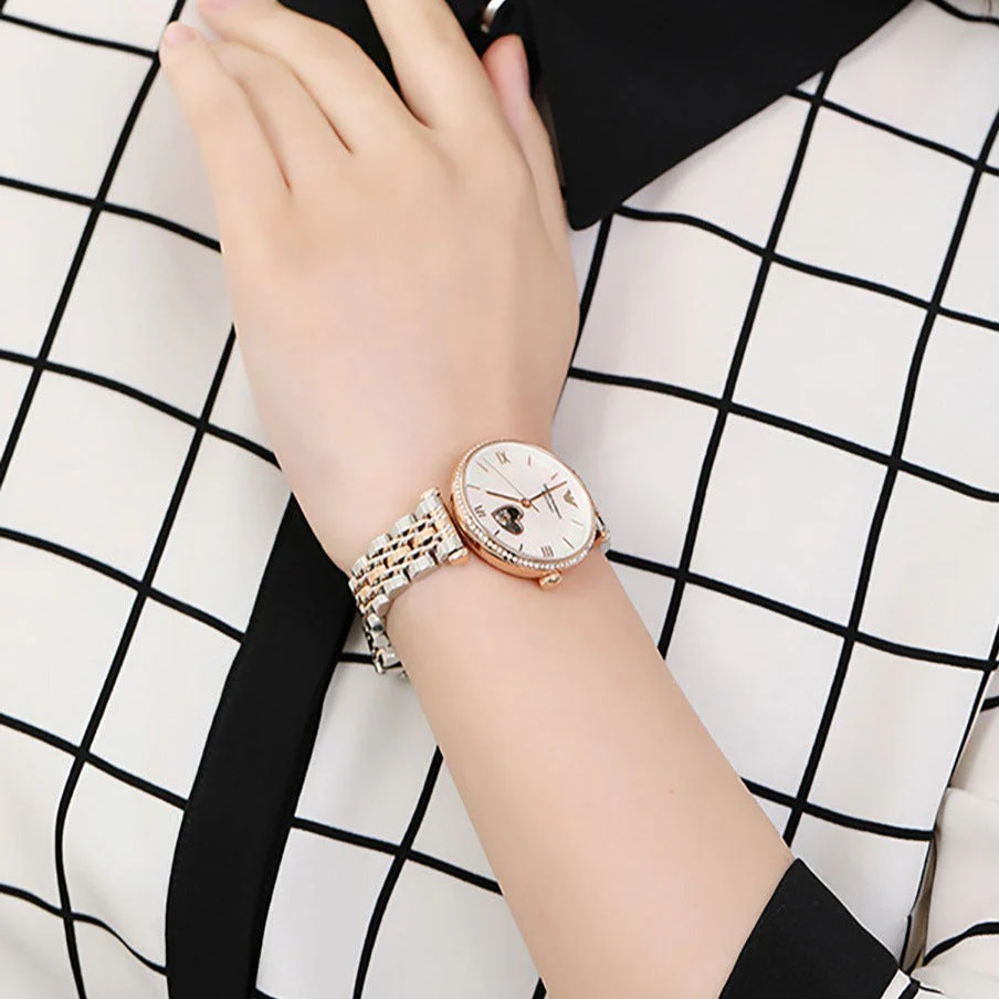 Rose gold-tone stainless steel case with a two-tone (silver-tone and rose gold-tone) stainless steel bracelet. Fixed rose gold-tone bezel set with crystals. White (open heart) dial with rose gold-tone hands and index hour markers. Roman numerals appear at the 3, 6 and 9 o'clock position. Automatic movement.