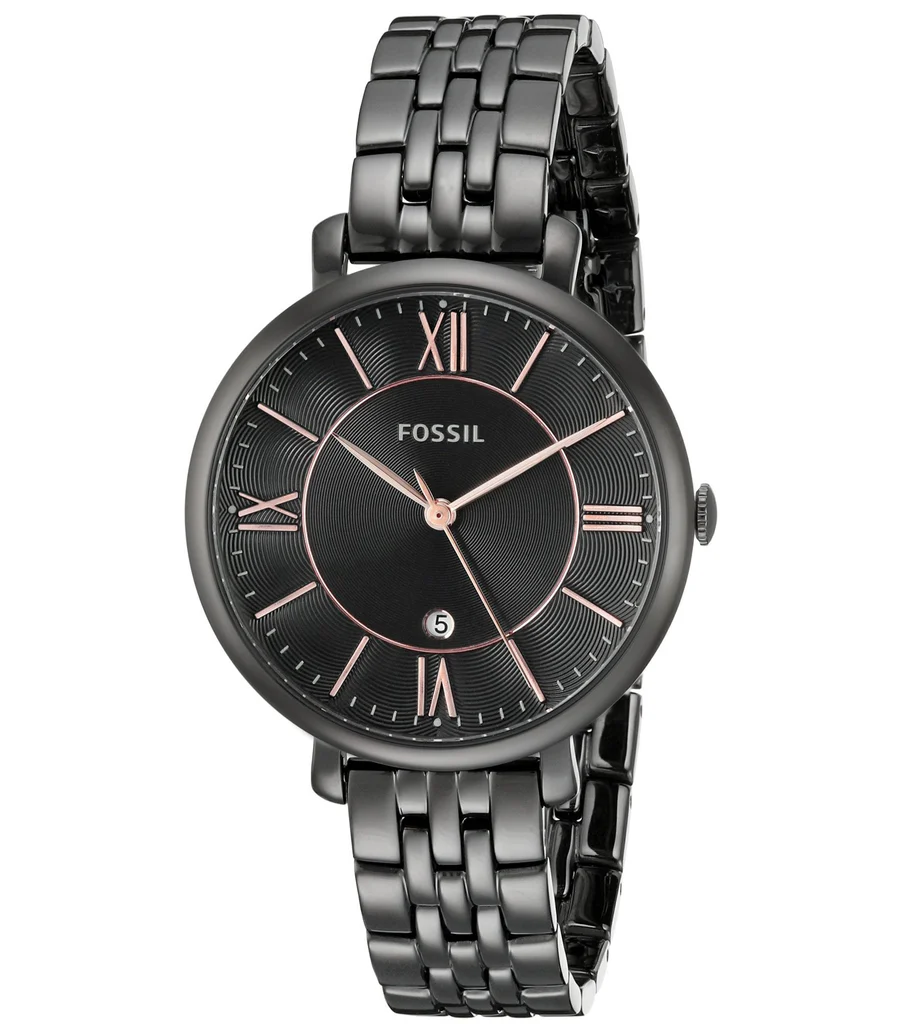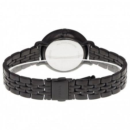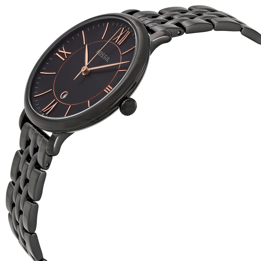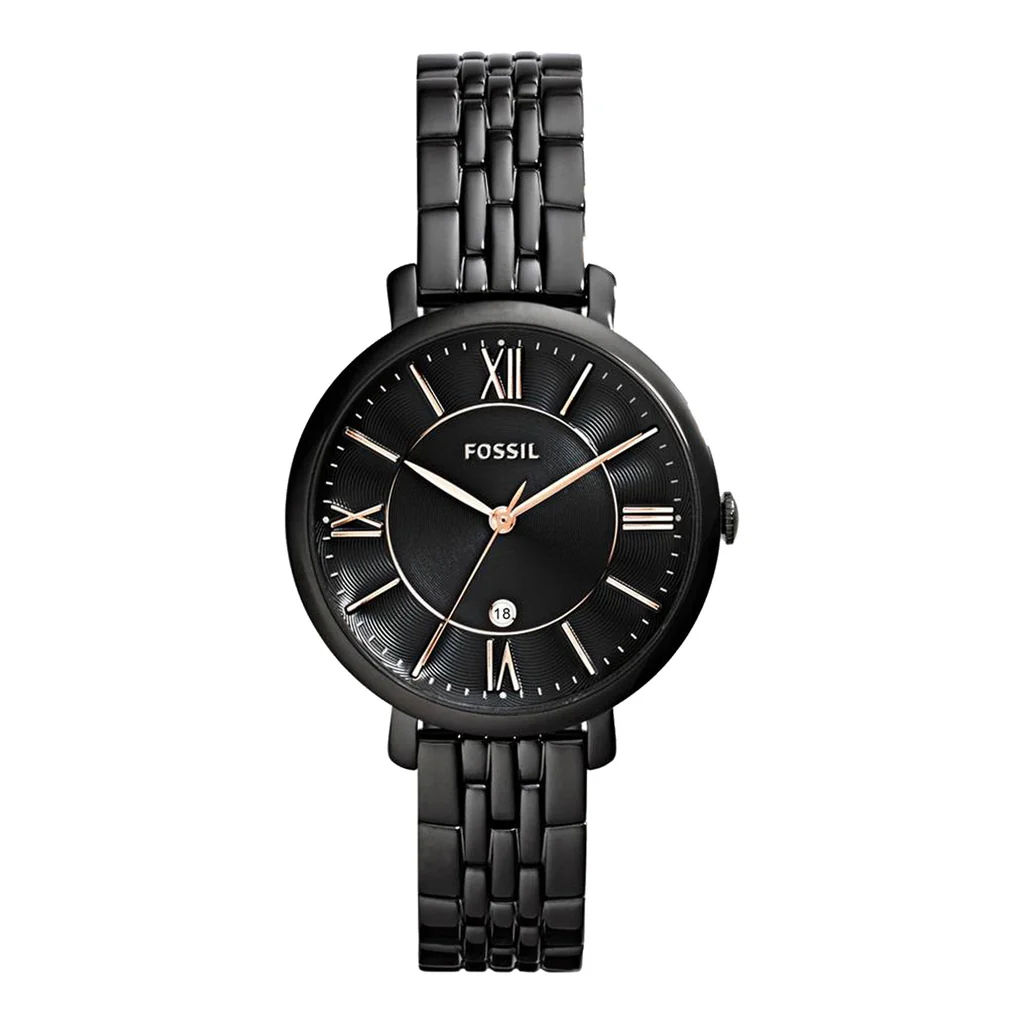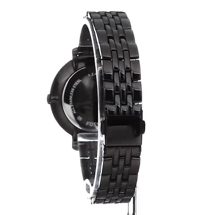 Case diameter: 36 mm. Case thickness: 8 mm. Round case shape. Band width: 14 mm. Band length: 7.5 inches. Deployment clasp with a push button release. Water resistant at 30 meters / 100 feet. Functions: date, hour, minute, second. Casual watch style. Fossil Jacquline Black Dial Black Ion-plated Ladies Watch ES3614.
