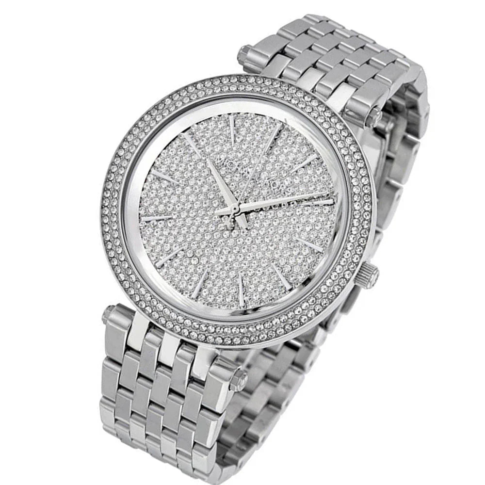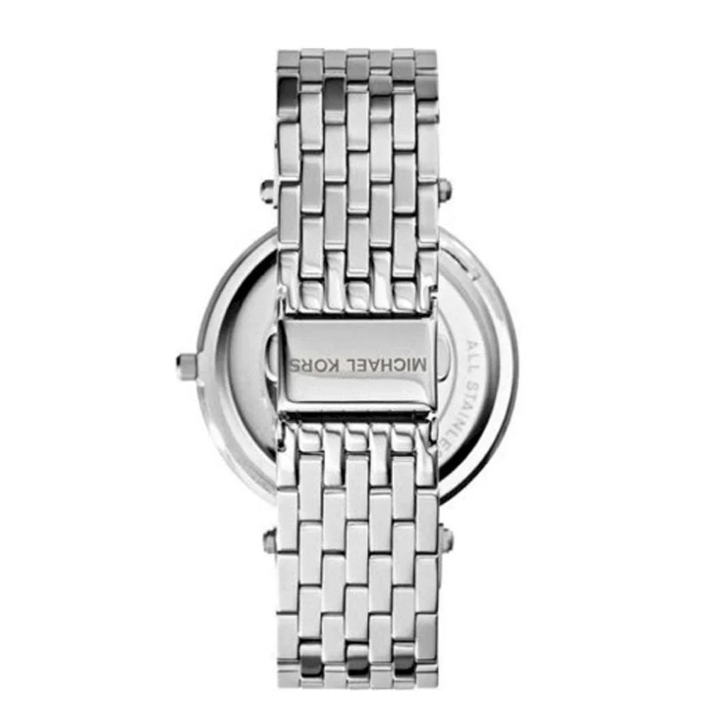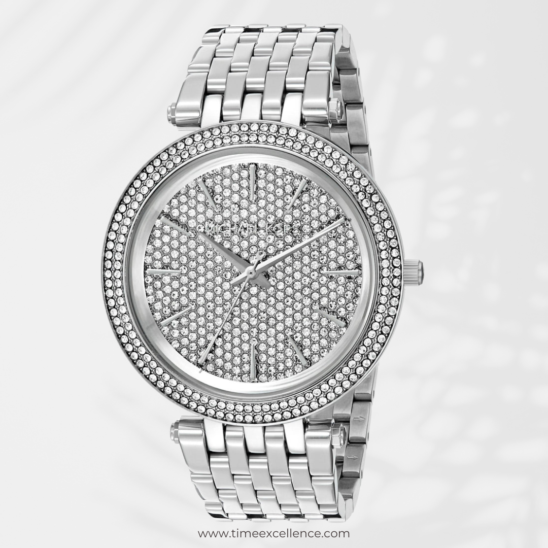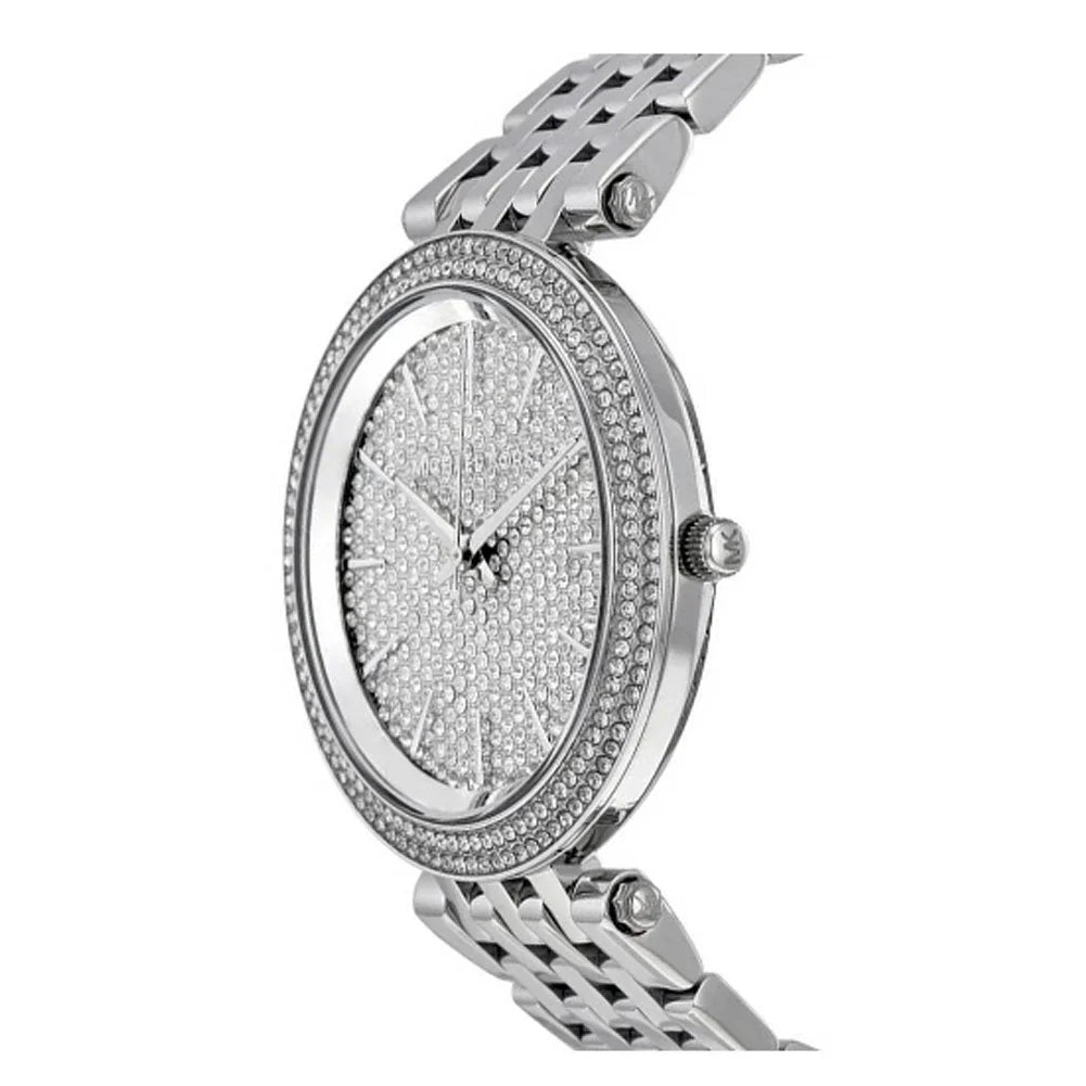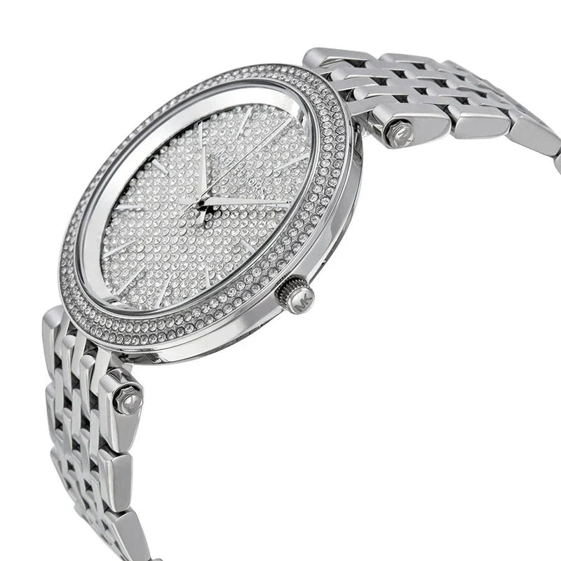 Stainless steel case with a stainless steel bracelet. Fixed stainless steel bezel set with crystals. Silver crystal pave dial with silver-tone hands and index hour markers. Dial Type: Analog. Quartz movement. Scratch resistant mineral crystal. Pull / push crown. Solid case back. Case diameter: 39 mm. Case thickness: 7 mm. Round case shape. Band width: 14 mm. Deployment clasp. Water resistant at 50 meters / 165 feet. Functions: hour, minute, second. Dress watch style. Michael Kors Darci Crystal Pave Dial Stainless Steel Ladies Watch MK3437.