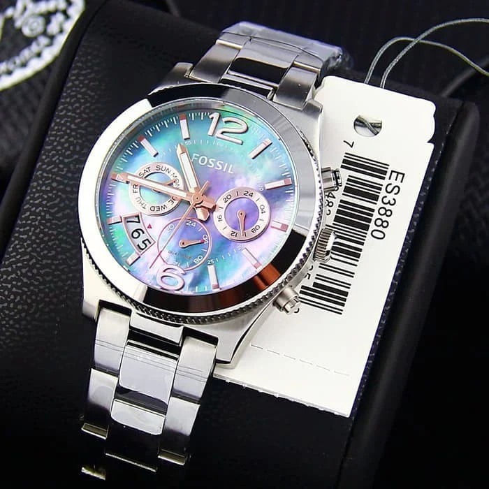 The Fossil Perfect Boyfriend Mother of Pearl Blue Dial Silver Steel Strap Watch for Women - ES3880 is a stunning timepiece designed for the modern woman. With a beautiful mother of pearl blue dial and a durable silver steel strap, this watch is both elegant and sturdy. Perfect for adding a touch of sophistication to any outfit.